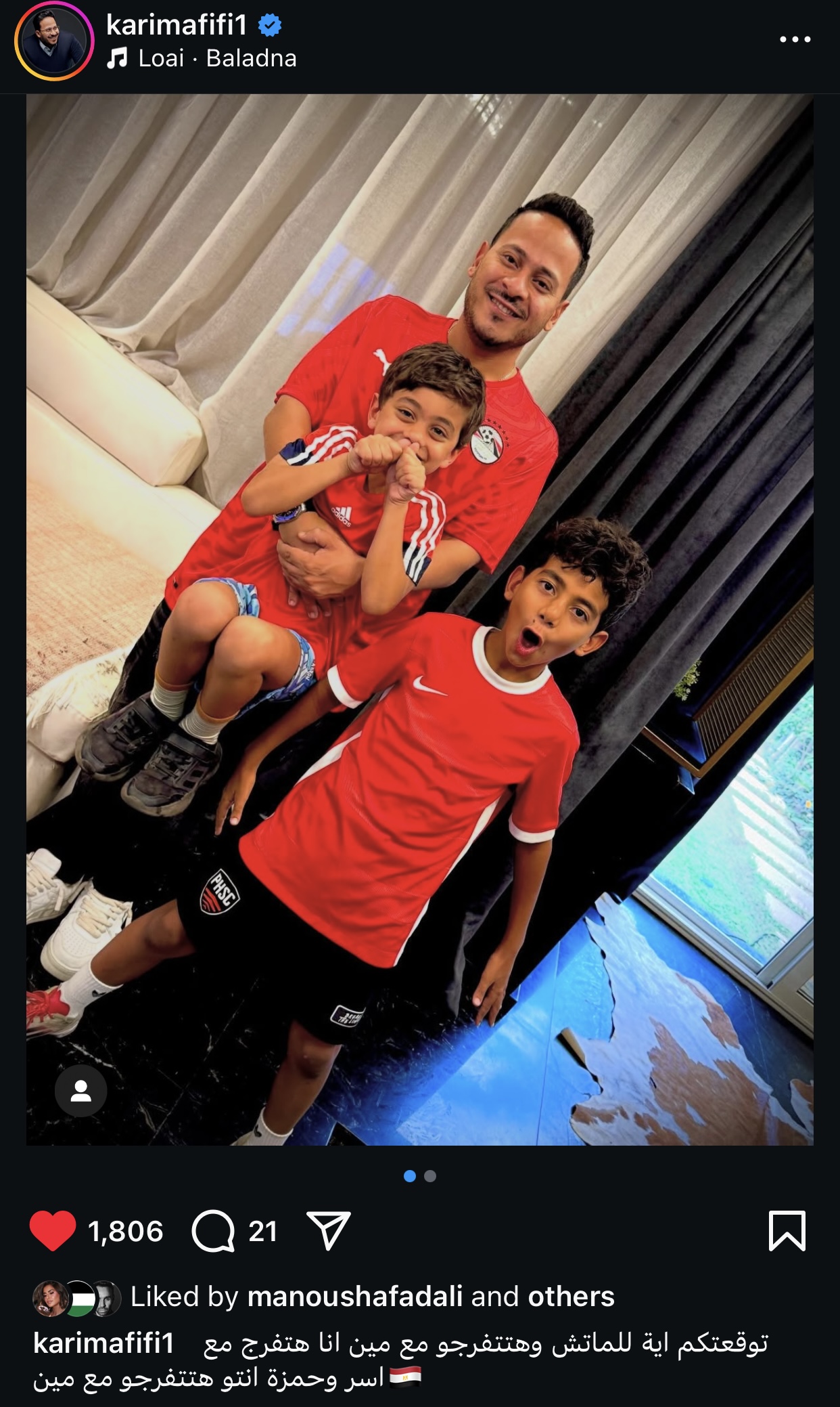 شارك الفنان كريم عفيفي، صورة له عبر حسابه الشخصي بموقع إنستجرام مع نجليه أثناء مشاهدتهم لمباراة المنتخب بتصفيات كأس العالم.