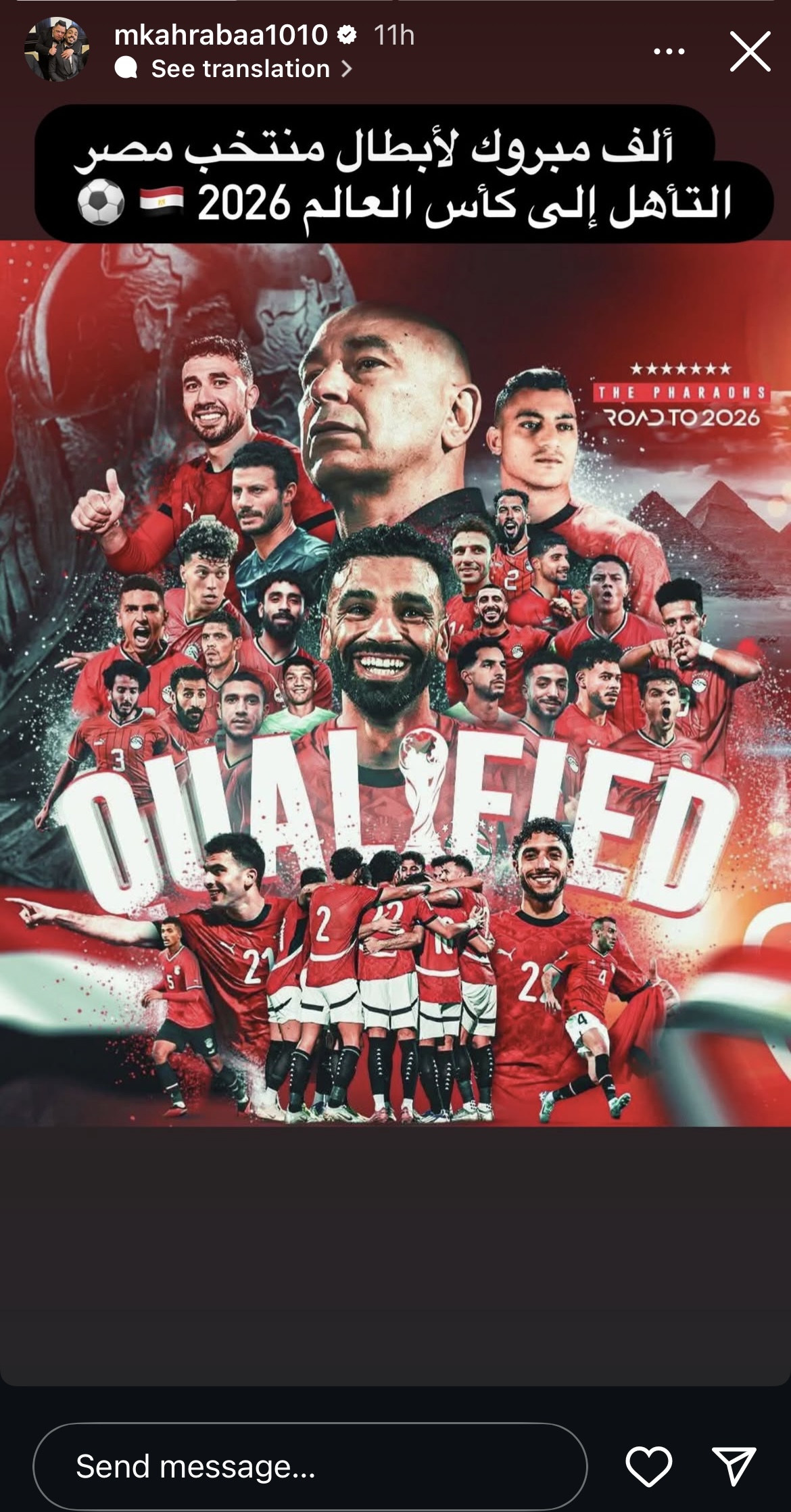 وكتب كهربا عبر انستجرام: “ألف مبروك لأبطال منتخبنا التأهل إلى كأس العالم ٢٠٢٦”.
