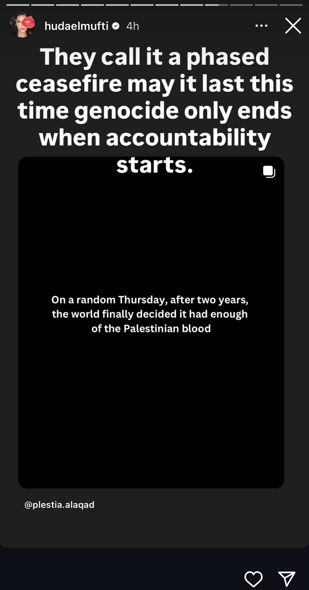 وكتبت هدى المفتي عبر ستوري انستجرام: “بعد سنتين من إراقة دماء الفلسطينيين الأبرياء وما شهده القطاع بأكمله، أتمنى أن يدوم ذلك للأبد، حان الوقت أن يفرح العالم الآن، بعد إيقاف عمليات الإبادة الجماعية التي راح ضحيتها مئات الشهداء”.