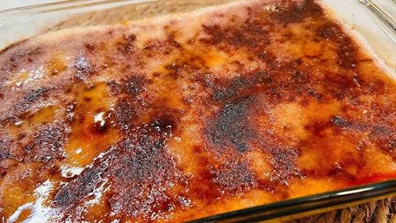 ـ بعد أن تبرد قليلًا، رشي السكر البني على الوجه، ثم استخدمي شعلة المطبخ (أو ضعيها تحت الشواية لبضع دقائق) حتى يتكرمل السكر ويأخذ لونًا ذهبيًا لامعًا.