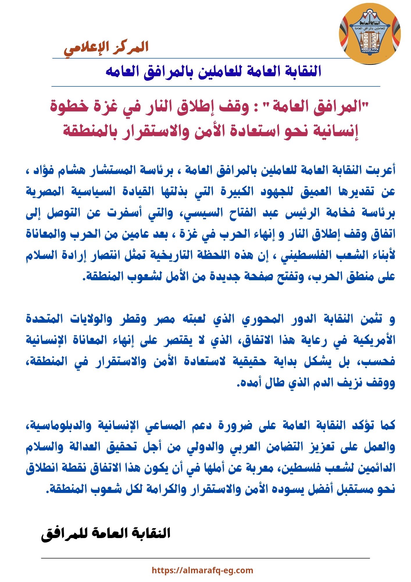 أعربت النقابة العامة للعاملين بالمرافق العامة برئاسة المستشار هشام فؤاد، عن تقديرها العميق للجهود الكبيرة التي بذلتها القيادة السياسية المصرية برئاسة الرئيس عبد الفتاح السيسي، والتي أسفرت عن التوصل إلى اتفاق وقف إطلاق النار و إنهاء الحرب في غزة، بعد عامين من الحرب والمعاناة لأبناء الشعب الفلسطيني.