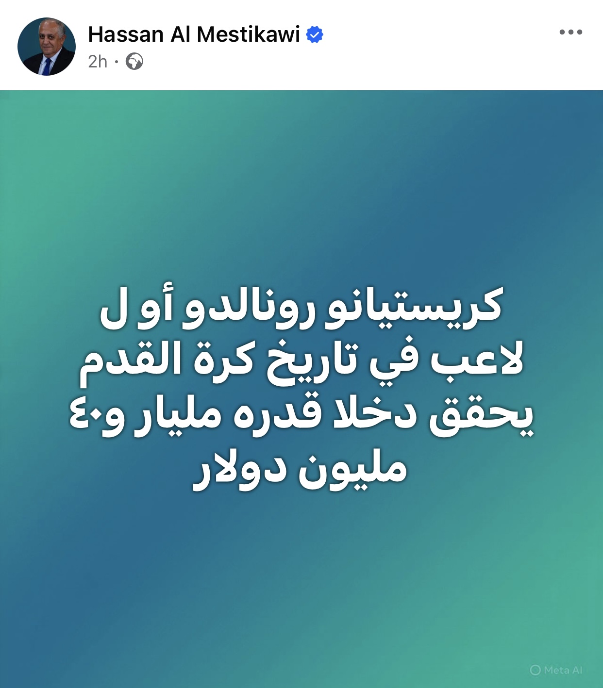 وكتب المستكاوي على حسابه الشخصي بموقع فيسبوك: “كريستيانو رونالدو أول لاعب في تاريخ كرة القدم يحقق دخلًا قدره مليار و٤٠ مليون دولار”.