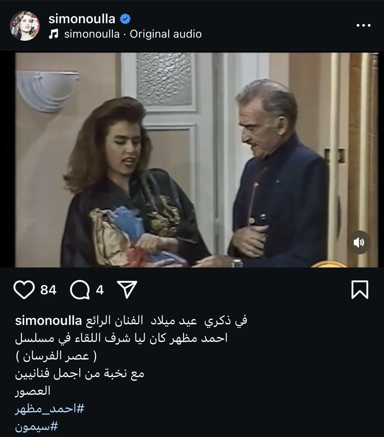 أحيت الفنانة سيمون، ذكرى ميلاد الفنان الراحل أحمد مظهر، وقامت بنشر مقطع من مسلسل عصر الفرسان، على حسابها الشخصي بموقع التواصل الإجتماعي إنستجرام، وعلقت عليه قائلة: "في ذكري عيد ميلاد الفنان الرائع احمد مظهر كان ليا شرف اللقاء في مسلسل