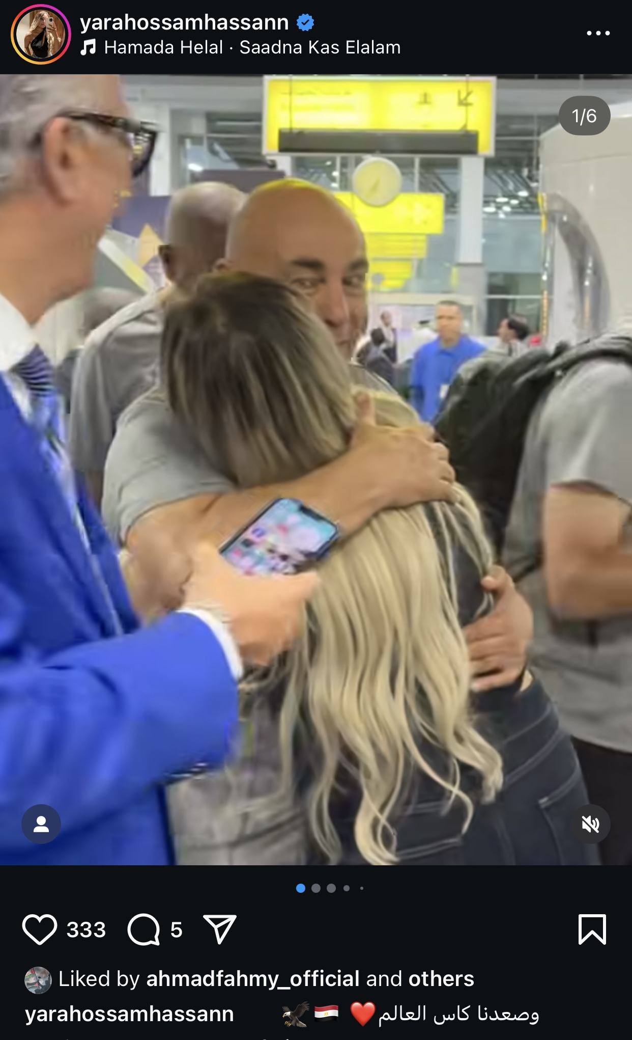شاركت يارا حسام حسن ابنة المدير الفني لمنتخب مصر حسام حسن، صورة مؤثرة من المطار، بعد إعلان تأهل المنتخب المصري إلى كأس العالم، حيث ظهرت وهي تحتضن والدها في مشهد مليء بالمشاعر والفرح.