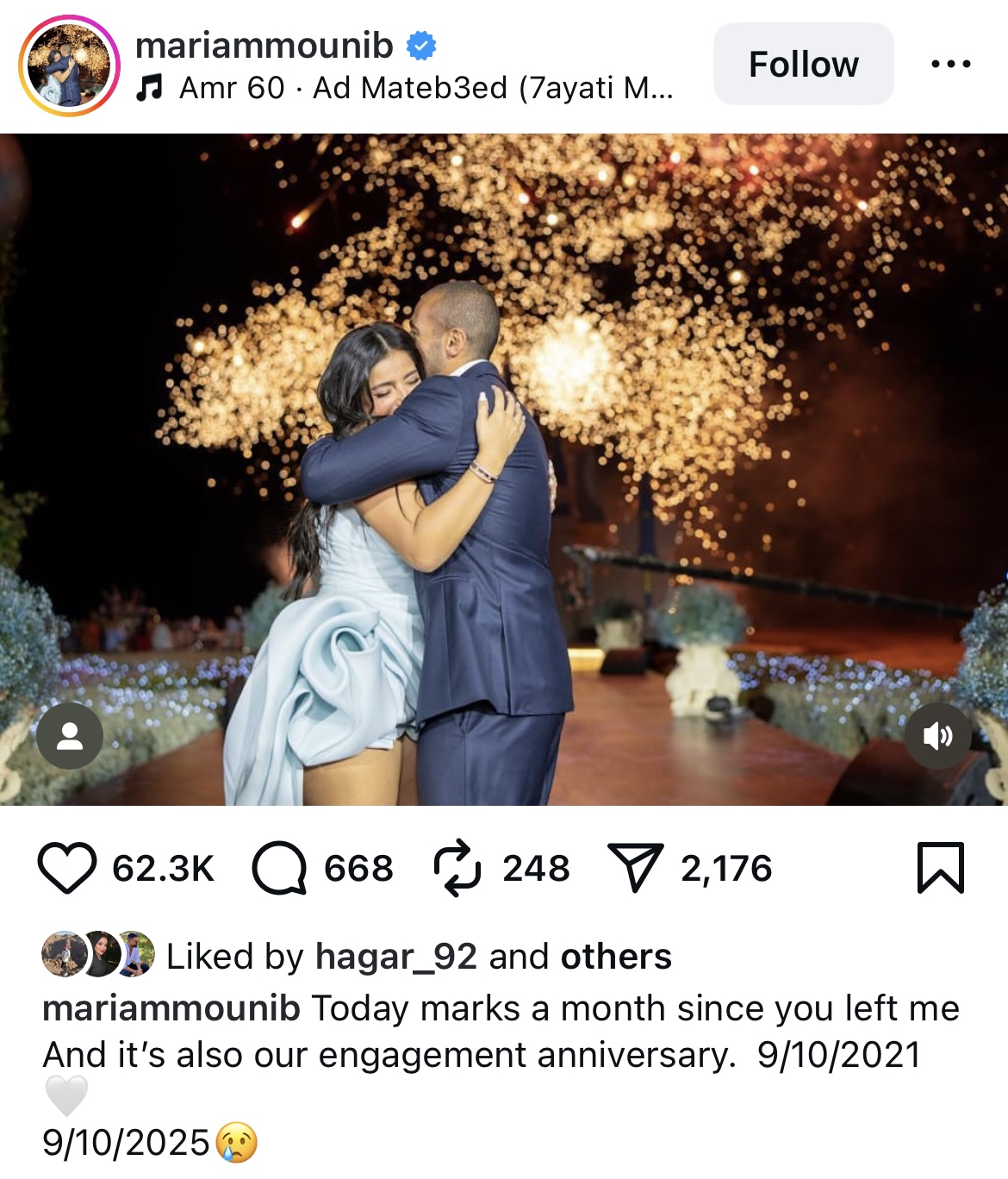 ونشرت مريم صورة لخطيبها عبر خاصية "ستوري" على موقع إنستجرام، وعلّقت بكلمات حزينة جاء فيها:«ادعوا لحبيبي بالرحمة.. أخدتك تزور غرفة بابا، ومكنتش أعرف أني بعرفك عليه، بابا هيهتم بيك كويس يا حبيبي، وأنا مستحيل أتوقف عن حبك».