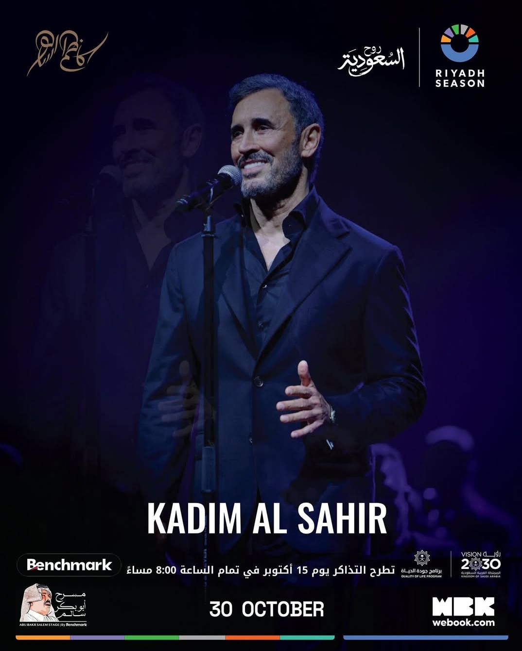 يستعد الفنان كاظم الساهر، لإحياء حفل غنائي على مسرح أبو بكر سالم، يوم 30 أكتوبر الجاري، ضمن فعاليات موسم الرياض بالمملكة العربية السعودية.