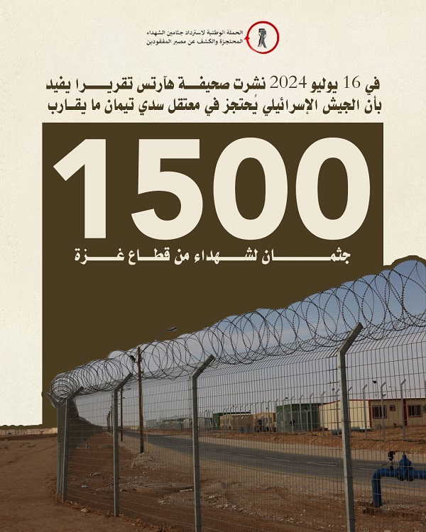 وأشارت اللجنة إلى أن صحيفة هآرتس الإسرائيلية نشرت تقريرا في 16 يوليو الماضي، يفيد بأن جيش الاحتلال يحتجز في معتقل "سديه تيمان" ما يقارب 1500 جثمان لشهداء من قطاع غزة، بحسب ما أفادت به وكالة الأنباء الفلسطينية الرسمية "وفا".