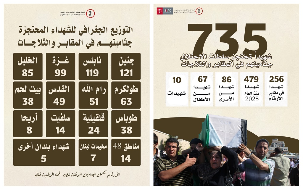 وقالت الحملة إن سلطات الاحتلال تحتجز جثامين 735 شهيدا في مقابر الأرقام والثلاجات، موضحة أن الجثث مقسمة بين مقابر الأرقام التي تحتجز 256 شهيدا، وهناك 479 شهيدا منذ بداية العام الجاري 2025، و86 شهيدا من المعتقلين، و67 شهيدا من الأطفال، و10 شهيدات.
