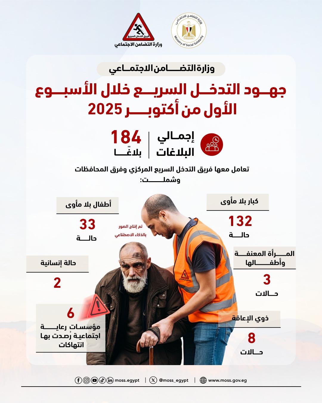 وبلغ عدد البلاغات التي تعامل معها فريق التدخل السريع خلال الأسبوع الأول من شهر أكتوبر الجاري نحو 184 بلاغًا متنوعًا، موزعة كالتالي "132 حالة كبار بلا مأوى ، و33 حالة أطفال بلا مأوى، و3 حالات للمرأة المعنفة وأطفالها بدون مأوى، و2 حالة إنسانية، و8 حالات لذوي الإعاقة، و6 مؤسسات رعاية اجتماعية رُصدت بها انتهاكات" .