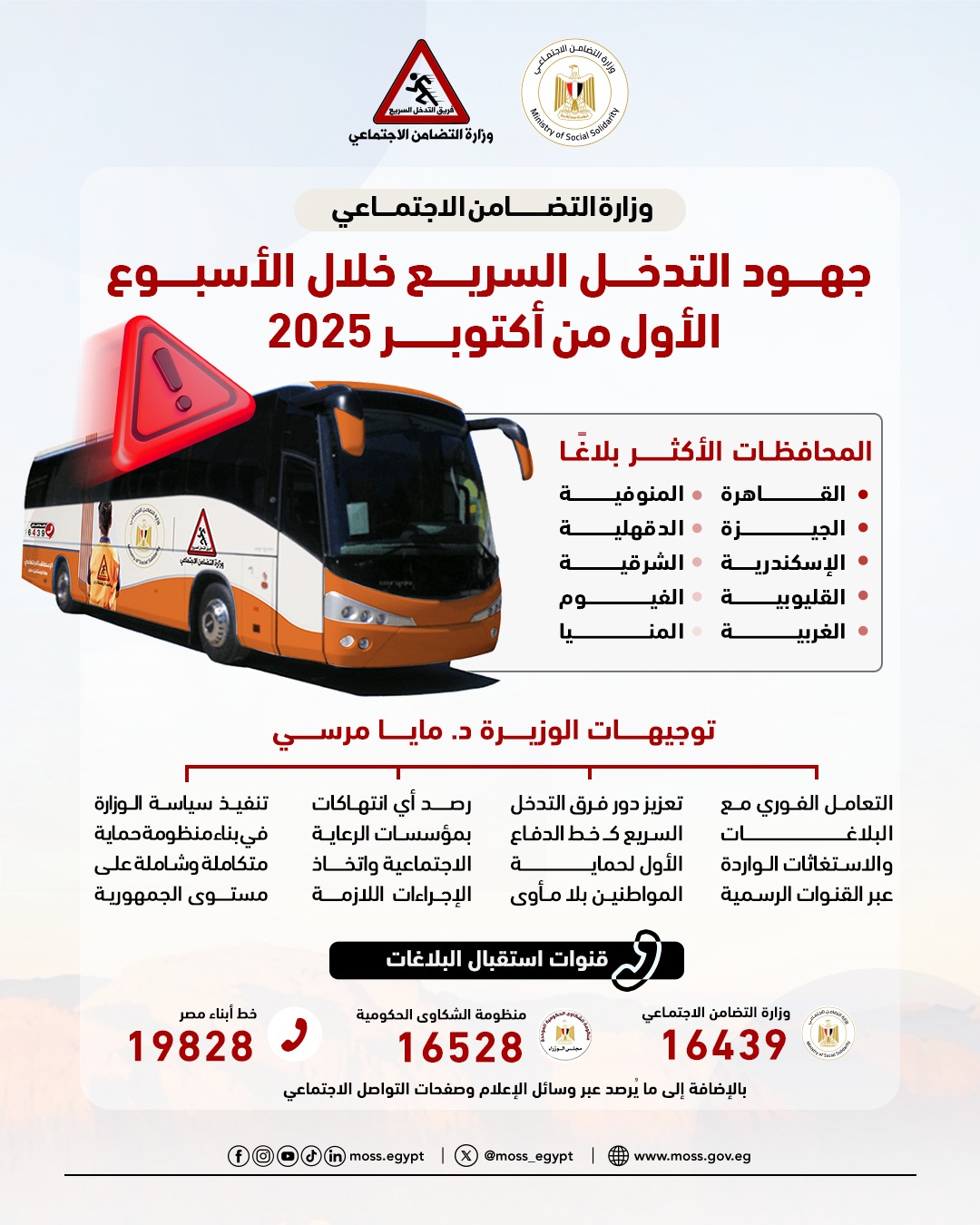 وجهت الدكتورة مايا مرسي وزيرة التضامن الاجتماعي فريق التدخل السريع المركزي وفرقه بالمحافظات بالتعامل مع عدد من الاستغاثات الواردة للوزارة لحالات الكبار والأطفال بلا مأوى، والمرأة المعنفة وأطفالها، والحالات الإنسانية في عدد من المحافظات، بالإضافة إلى الشكاوى الواردة على منظومة الشكاوى الحكومية الموحدة برئاسة مجلس الوزراء، وصفحات التواصل الاجتماعي، ومنصات الإبلاغ المختلفة التابعة للوزارة.