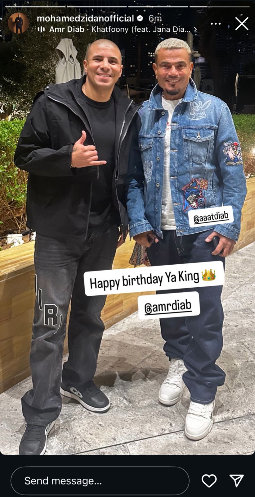 وحرص زيدان على تهنئة الهضبة عمرو دياب في عيد ميلاده، وكتب عبر خاصية الاستوري: “كل سنة وانت طيب يا ملك”.