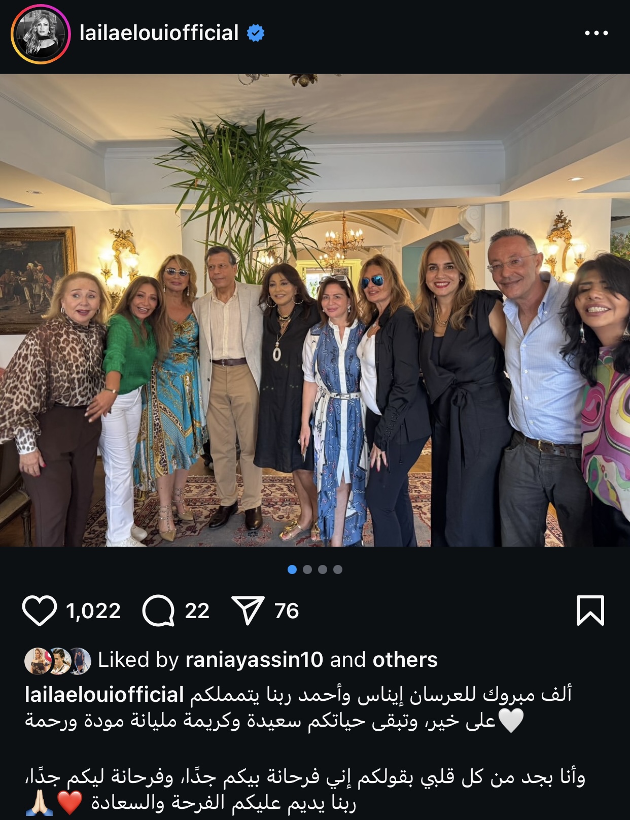 وكتبت ليلى علوي على صفحتها الشخصية بموقع إنستجرام: "ألف مبروك للعرسان إيناس وأحمد ربنا يتمملكم على خير، وتبقى حياتكم سعيدة وكريمة مليانة مودة ورحمة وأنا بجد من كل قلبي بقولكم إني فرحانة بيكم جدًا، وفرحانة ليكم جدًا،