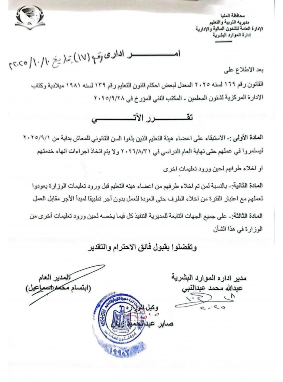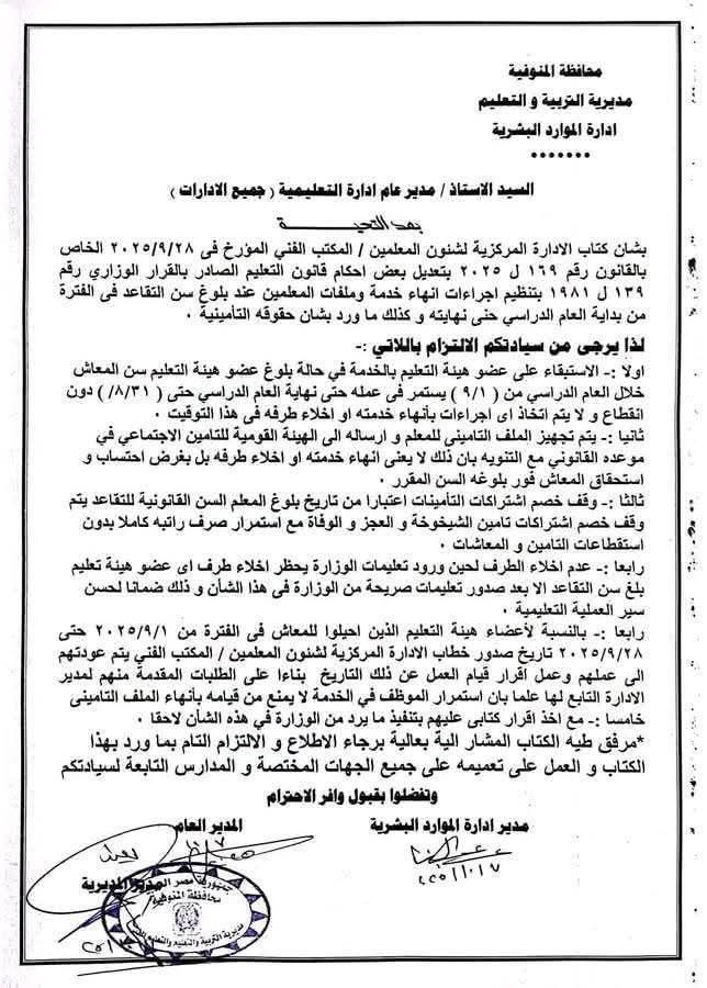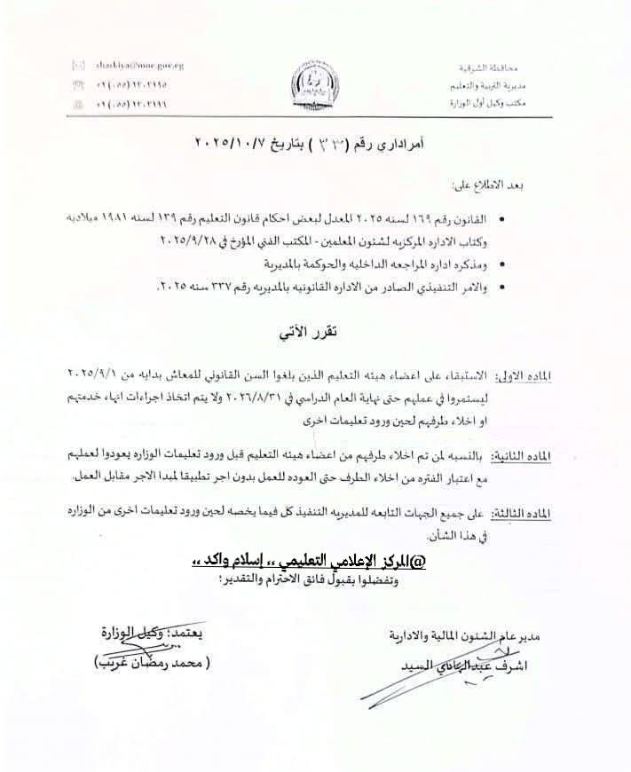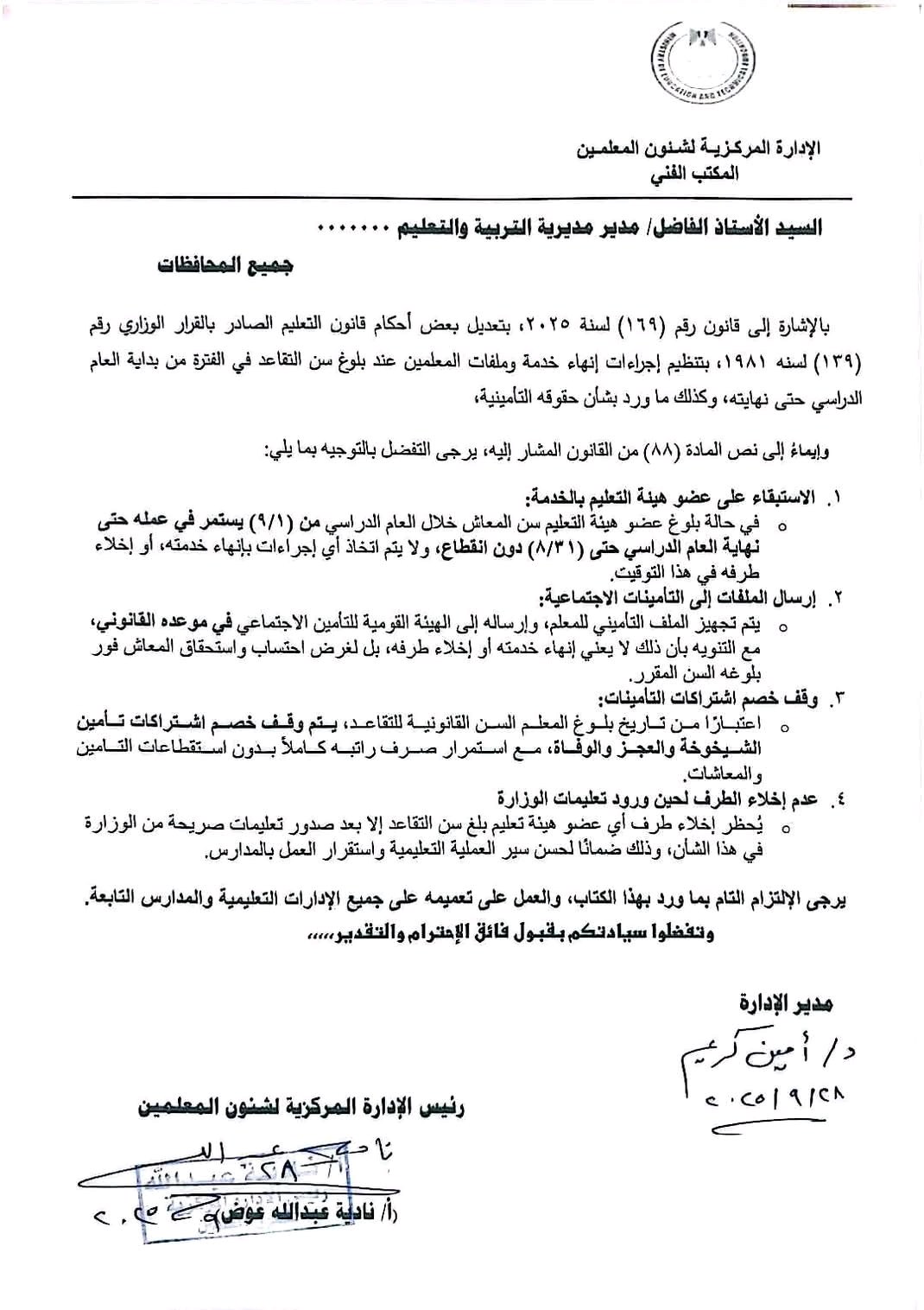 وقررت وزارة التربية والتعليم والتعليم الفني أن يحظر اخلاء طرف أي معلم بلغ سن التقاعد إلا بعد صدور تعليمات صريحة من وزارة التربية والتعليم في هذا الشأن وذلك ضمانا لحسن سير العملية التعليمية واستقرار العمل بالمدارس
