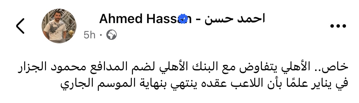 وكتب أحمد حسن على حسابه الشخصي بموقع فيسبوك: " الأهلي يتفاوض مع البنك الأهلي لضم المدافع محمود الجزار في يناير علمًا بأن اللاعب عقده ينتهي بنهاية الموسم الجاري".