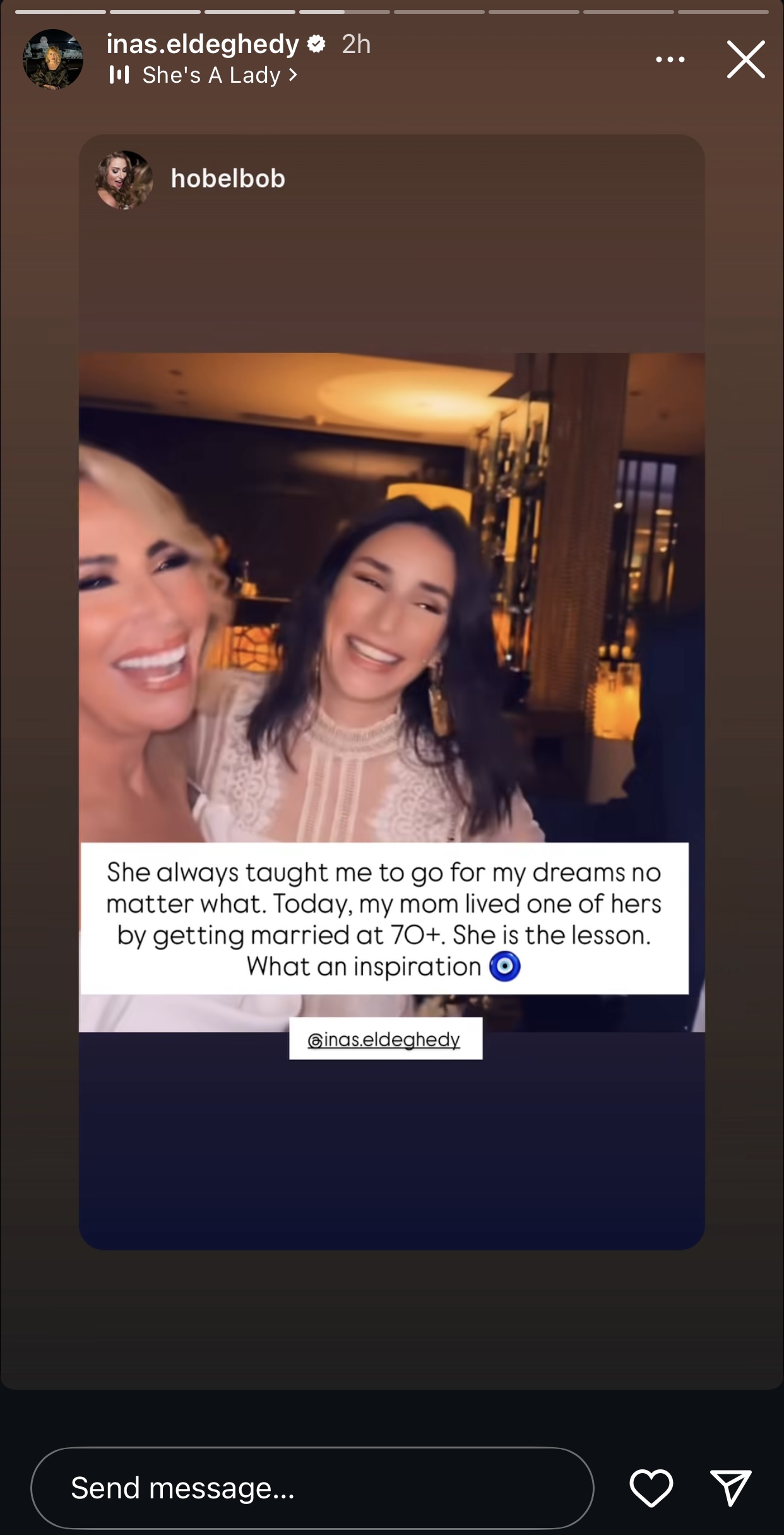 وكتبت حبيبة على حسابها الشخصي بموقع إنستجرام: "أمي علمتني دائمًا أن أطارد أحلامي دون تردد. واليوم، حققت هي حلمها بالزواج في سن السبعين. إنها قدوتي ومصدر إلهامي".