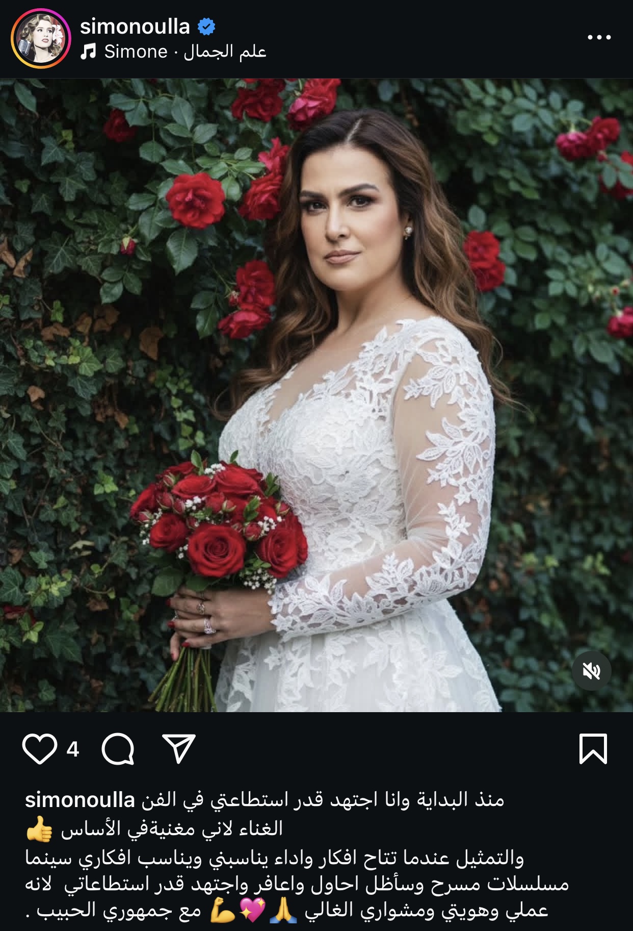 وقالت سيمون عبر حسابها الرسمي على موقع التواصل الاجتماعي إنستجرام: “منذ البداية وأنا اجتهد قدر استطاعتي في فن الغناء لأني مغنية في الأساس، والتمثيل عندما تتاح أفكار وأداء يناسبني ويناسب أفكاري، سواء في السينما أو المسلسلات أو المسرح. وسأظل أحاول وأعافر واجتهد قدر استطاعتي لأنه عملي وهويتي ومشواري الغالي مع جمهوري الحبيب.
