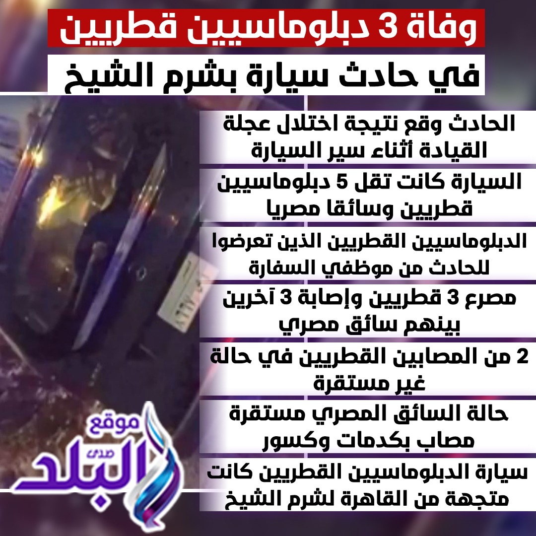 أفادت قناة القاهرة الإخبارية ،في نبأ عاجل لها عن وفاة 3 دبلوماسيين قطريين في حادث سيارة بشرم الشيخ.