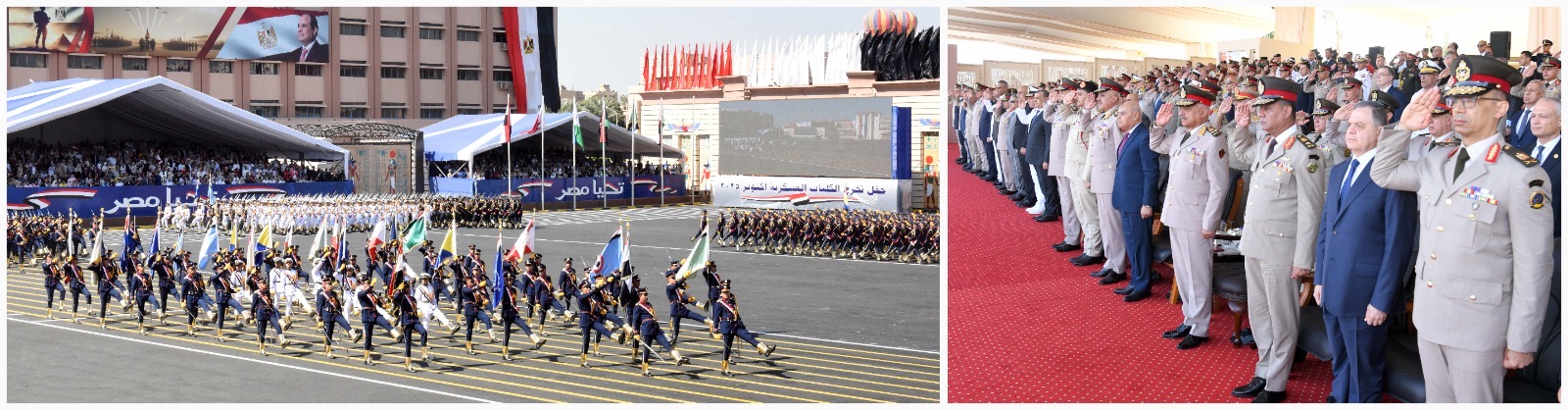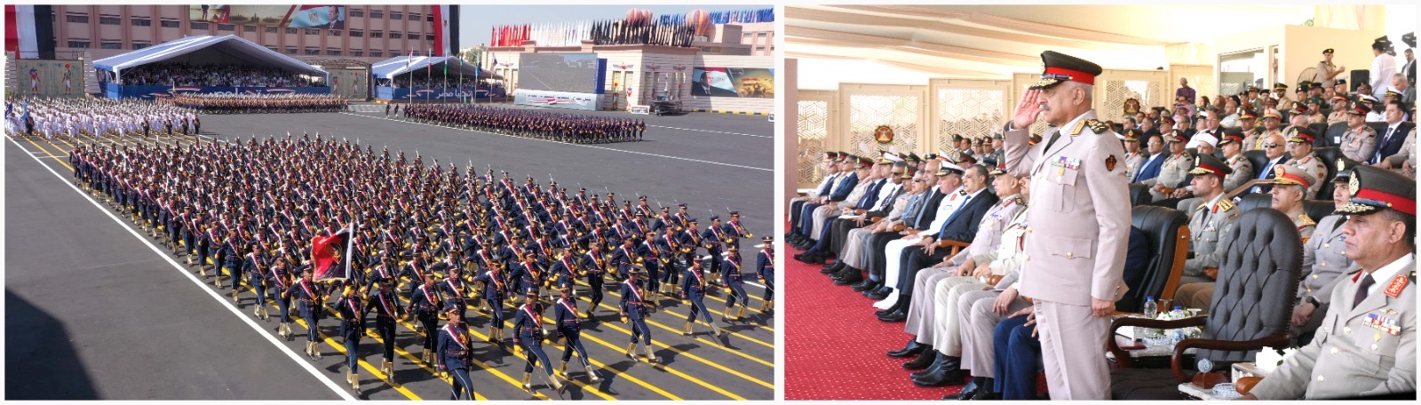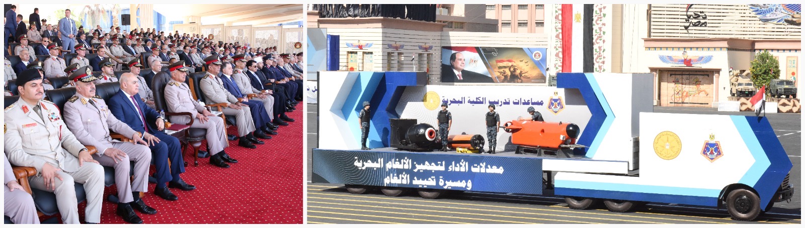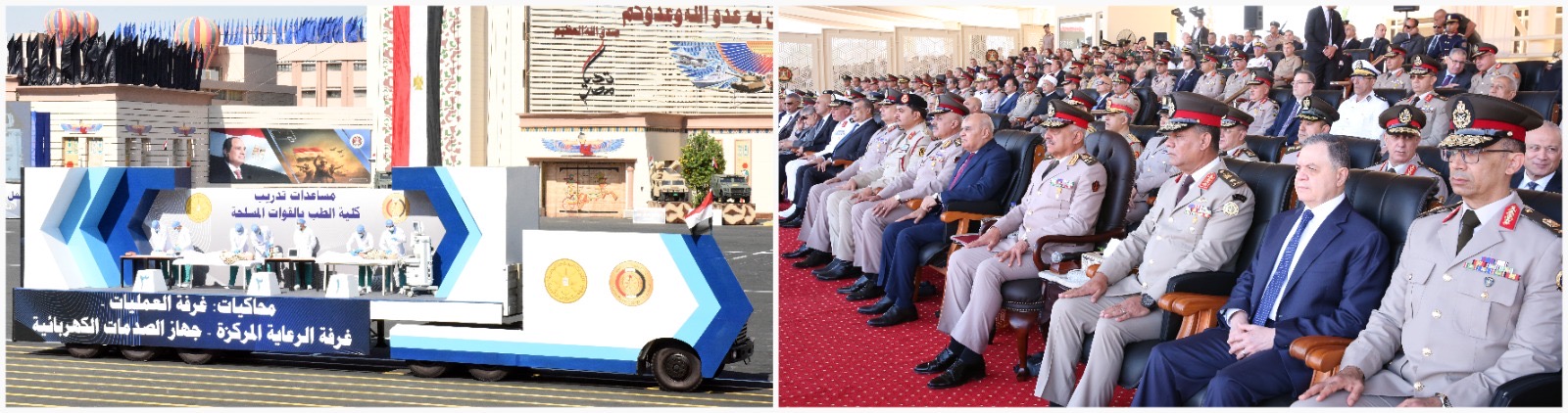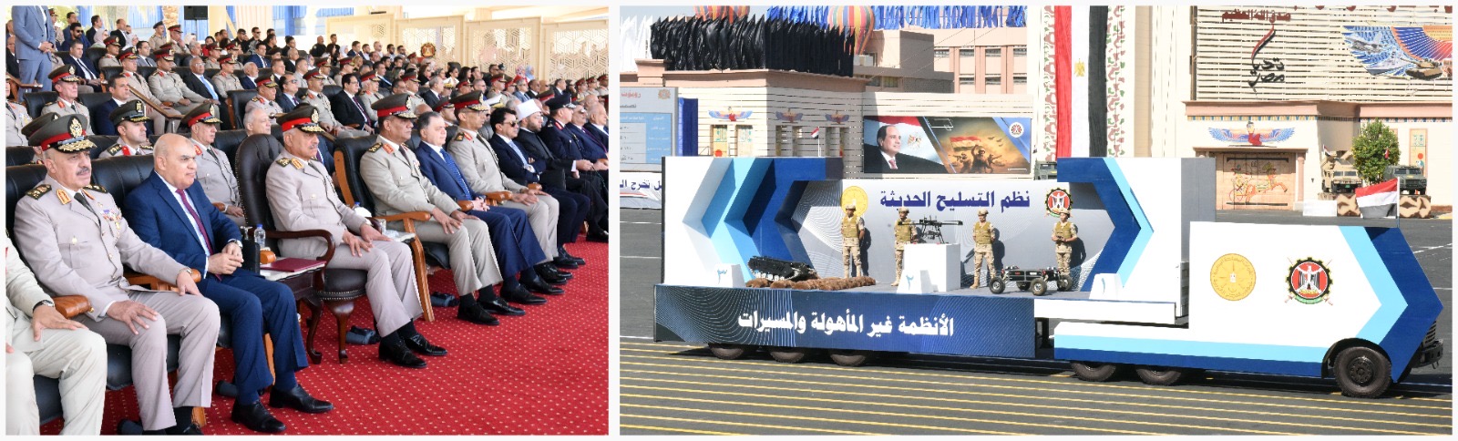 تلى ذلك عرض عدد من نماذج نظم التسليح الحديثة والتى تهدف إلى مواكبة أحدث النظم العلمية والتكنولوجية فى ظل التطور المتسارع فى نظم التسليح المتكاملة والمسيرات ، وقدمت الموسيقات العسكرية عرضا متميزا أظهر مدى التوافق الحركى والدقة فى العزف من الحركة.