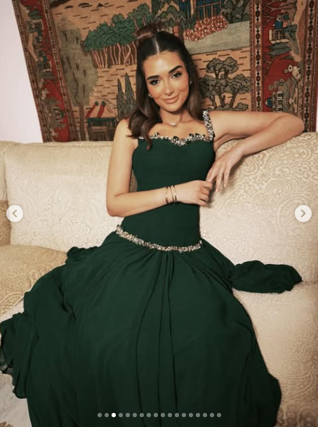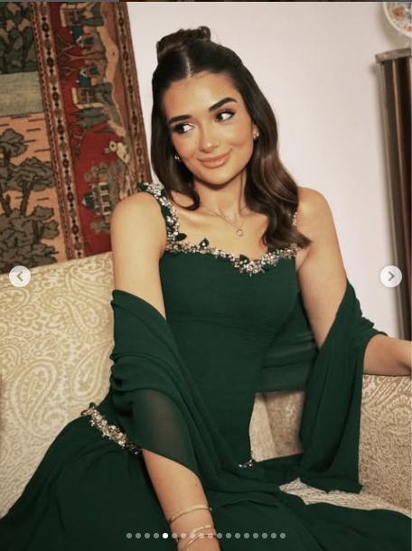 تألقت ملك أحمد زاهر في الصور بإطلالة كشفت عن رشاقتها الملفتة، حيث ارتدت فستانا طويلا ذا أكمام مكشوفة، واتسم باللون الزيتي الذي حمل بعض التطريزات البسيطة.