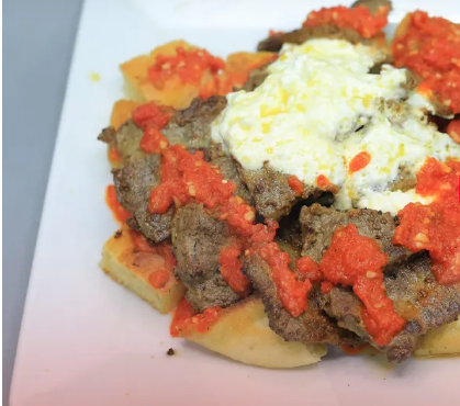 يضاف صوص الطماطم وقطع اللحمة والزبادي والزبدة السايحة، ثم يُقدَّم.