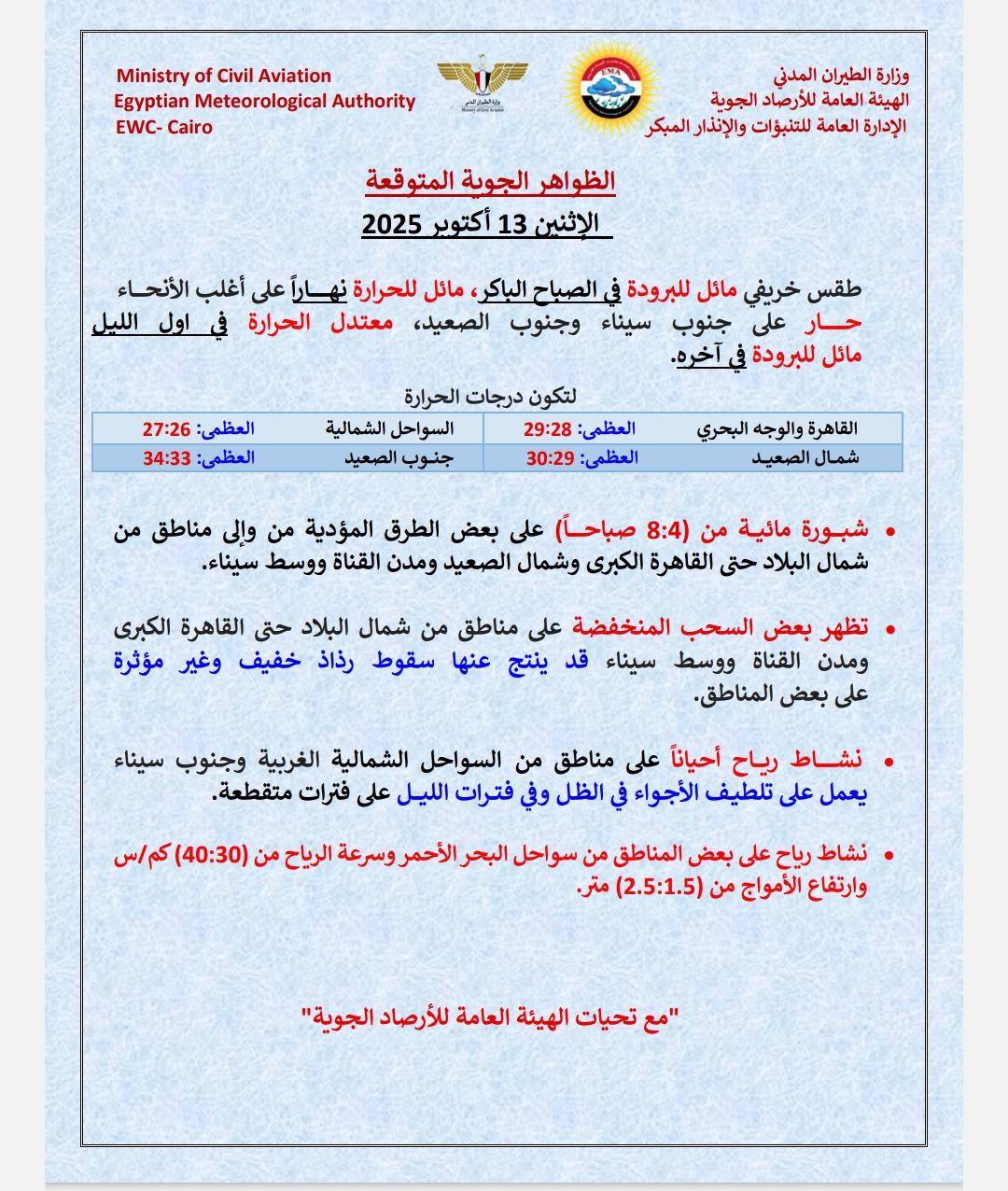 أعلنت هيئة الأرصاد الجوية ،عن طقس اليوم الأثنين خريفي مائل للبرودة في الصباح الباكر،مائل للحرارة نهاراً على أغلب الأنحاء حار على جنوب سيناء وجنوب الصعيد،معتدل الحرارة في اول الليل مائل للبرودة في أخره.