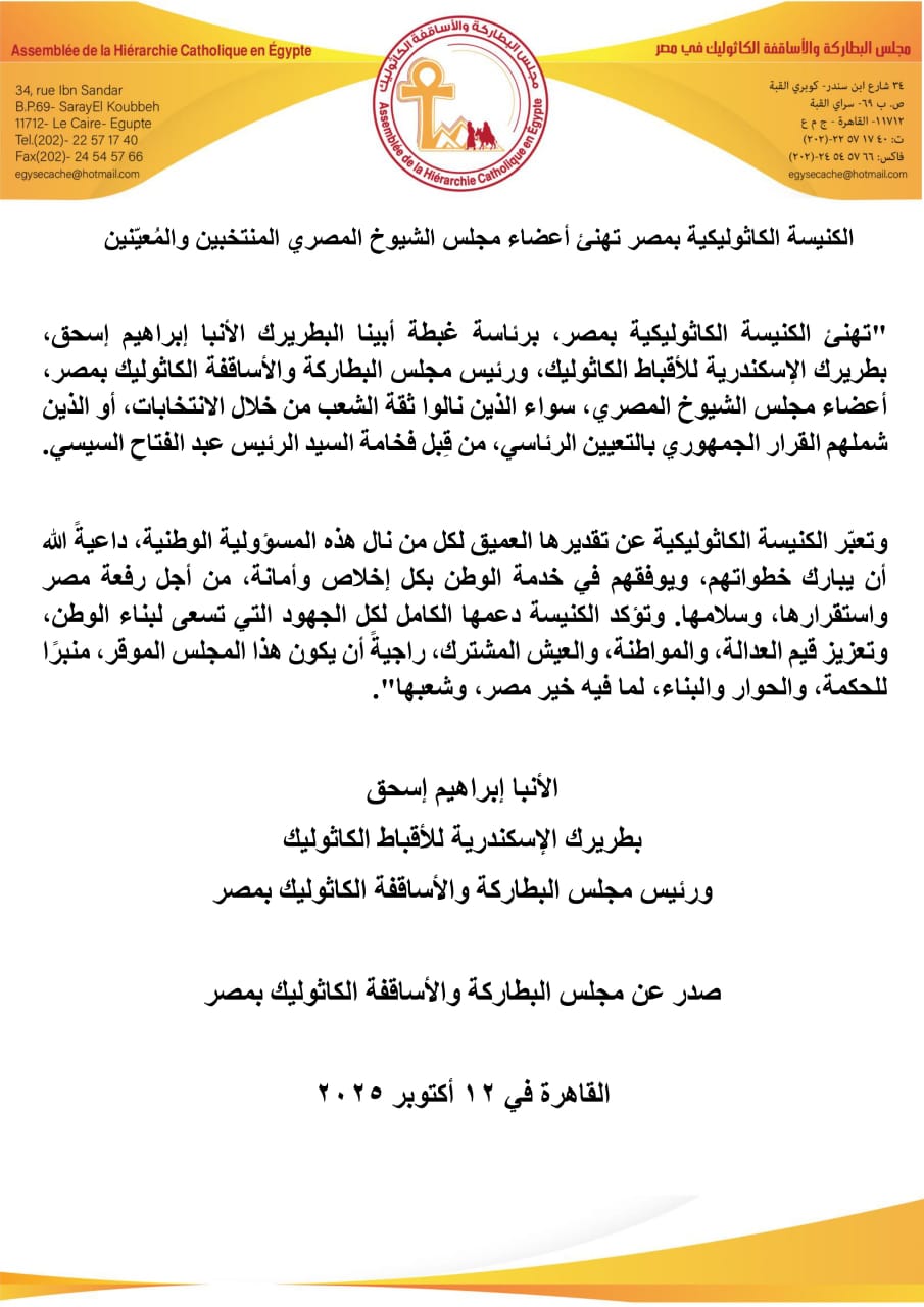 هنأت الكنيسة الكاثوليكية بمصر، برئاسة غبطة البطريرك الأنبا إبراهيم إسحق، بطريرك الإسكندرية للأقباط الكاثوليك، ورئيس مجلس البطاركة والأساقفة الكاثوليك بمصر، أعضاء مجلس الشيوخ المصري، سواء الذين نالوا ثقة الشعب من خلال الانتخابات، أو الذين شملهم القرار الجمهوري بالتعيين الرئاسي، من قِبل فخامة السيد الرئيس عبد الفتاح السيسي.