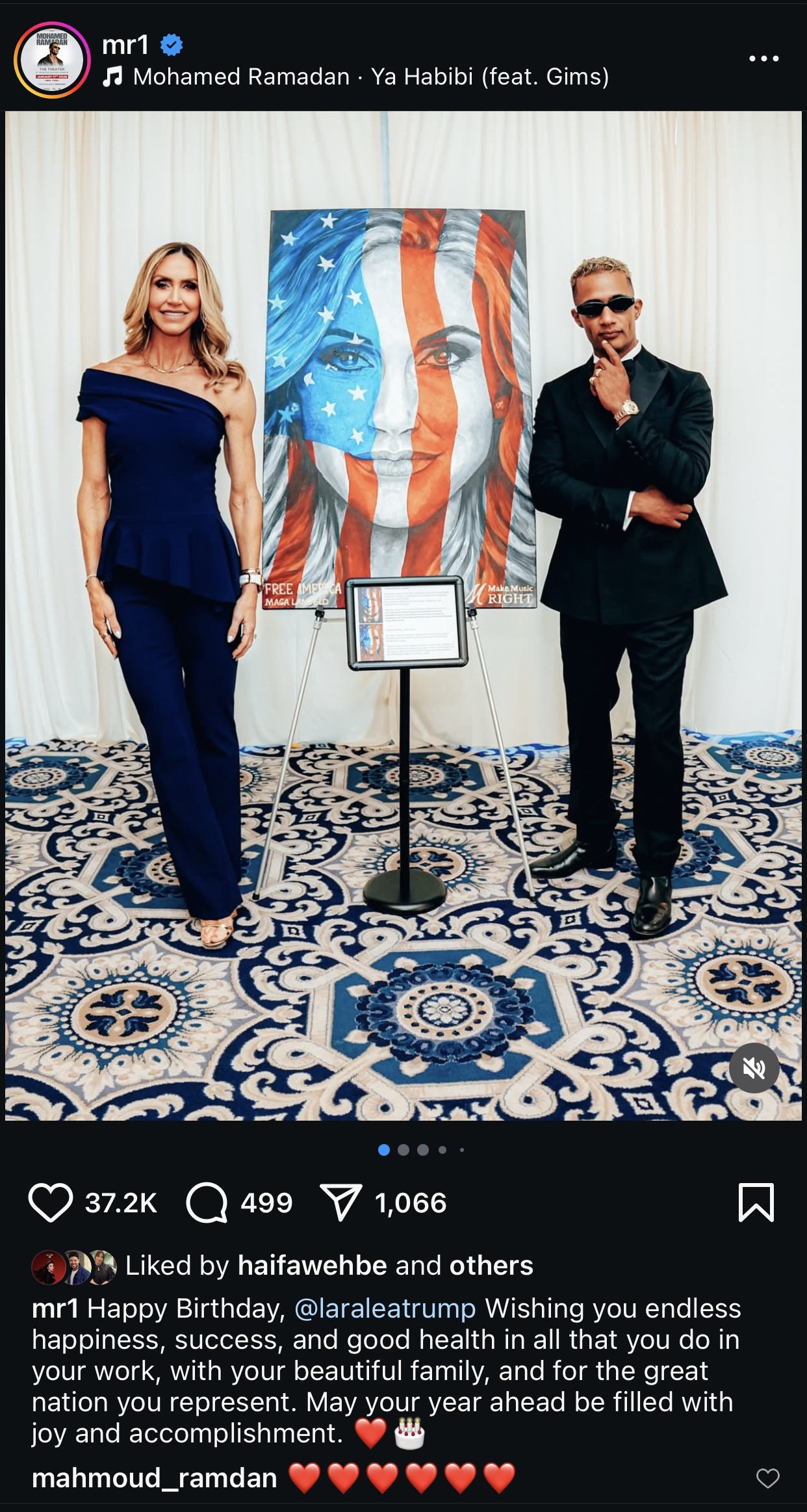 ونشر رمضان صورة تجمعهما سويًا على حسابه الخاص بموقع إنستجرام وعلق عليها قائلاً: "عيد ميلاد سعيد، لارا ترامب أتمنى لك سعادة لا تنتهي، نجاحًا دائمًا، وصحة جيدة في كل ما تفعله في عملك، مع عائلتك الجميلة، وللدولة العظيمة التي تمثلها. أتمنى أن يكون عامك القادم مليئًا بالفرح والإنجاز"