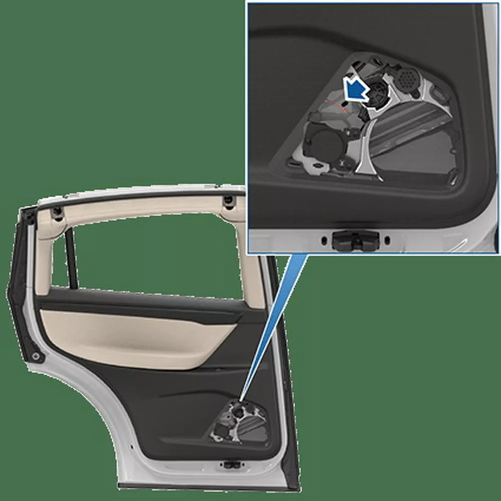 يجب سحب شبكة مكبر الصوت من غطاء الباب للوصول إلى كابل التحرير الميكانيكي الموجود أعلى الجزء الداخلي المكشوف.