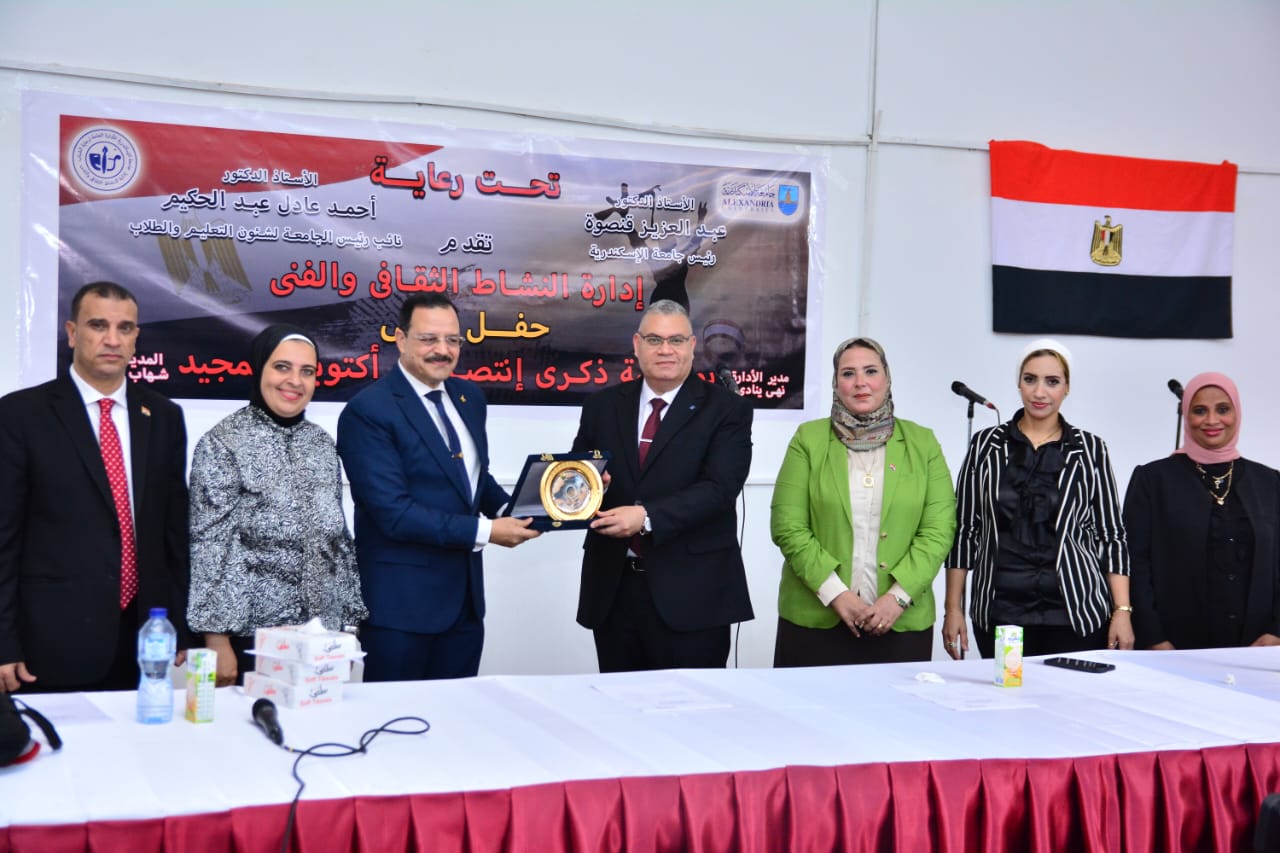 نظّمت كلية التربية لقاءً تثقيفيًا بعنوان "استراتيجيات الأمن القومي في ضوء دروس أكتوبر"، حاضر فيه اللواء أ.ح.د مهندس حافظ حسن، الخبير في استراتيجيات الأمن القومي، وبمشاركة كورال جامعة الإسكندرية، وذلك فى إطار احتفالات جامعة الإسكندرية بالذكرى الثانية والخمسين لانتصارات أكتوبر المجيدة، وتحت رعاية الدكتور عبد العزيز قنصوه، رئيس الجامعة.