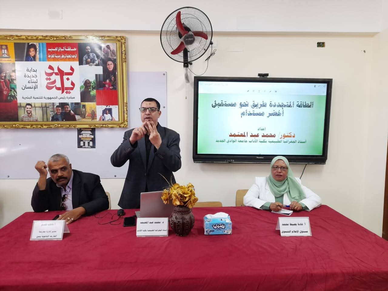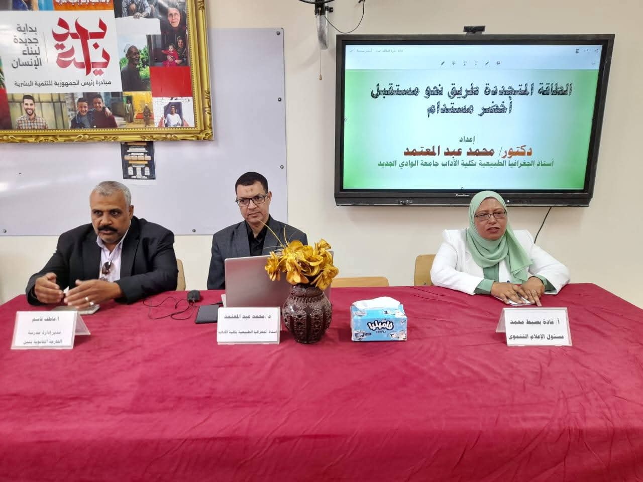 عقد مجمع إعلام الوادى الجديد بالتعاون مع قطاع التعليم اليوم الإثنين الموافق ٢٠٢٥/١٠/١٣ ندوة حول ( الطاقة المتجددة نحو مستقبل أخضر مستدام ) وذلك ضمن الحملة الإعلامية التى يطلقها قطاع الإعلام الداخلى بالهيئة العامة للاستعلامات تحت شعار( أمن الطاقة مسئولية الجميع ) وذلك تحت رعاية الدكتور ضياء رشوان رئيس الهيئة العامة للاستعلامات وبناء على توجيهات الدكتور أحمد يحيى رئيس قطاع الإعلام الداخلى