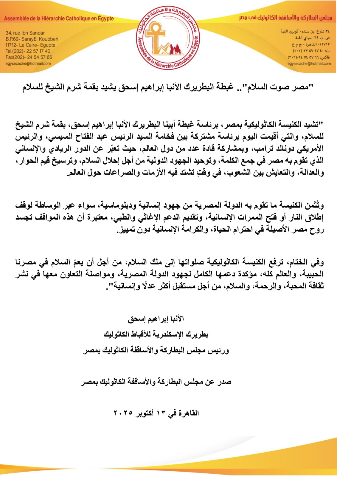 أشادت الكنيسة الكاثوليكية بمصر، برئاسة غبطة البطريرك الأنبا إبراهيم إسحق، بقمة شرم الشيخ للسلام، والتي أقيمت اليوم برئاسة مشتركة بين فخامة السيد الرئيس عبد الفتاح السيسي، والرئيس الأمريكي دونالد ترامب، وبمشاركة قادة عدد من دول العالم، حيث تعبّر عن الدور الريادي والإنساني الذي تقوم به مصر في جمع الكلمة، وتوحيد الجهود الدولية من أجل إحلال السلام، وترسيخ قيم الحوار، والعدالة، والتعايش بين الشعوب، في وقتٍ تشتد فيه الأزمات والصراعات حول العالم.