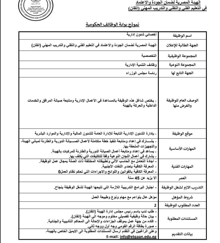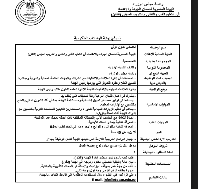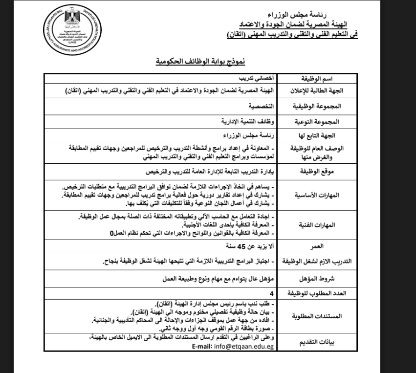 أعلنت الهيئة المصرية لضمان الجودة والإعتماد في التعليم الفني والتقني والتدريب المهني (إتقان) - عن حاجتها لشغل الوظائف التالية وهي وظائف تخصصية عن طريق الندب