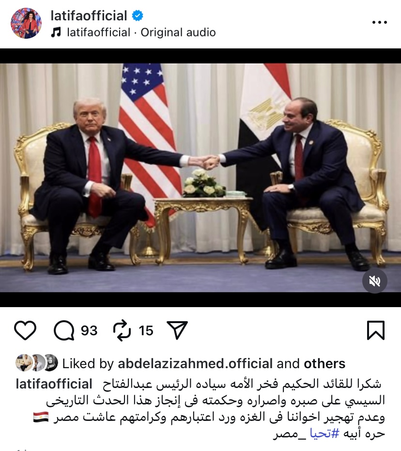 وكتبت لطيفة عبر حسابه على موقع التواصل الاجتماعي فيسبوك : ”شكرا للقائد الحكيم فخر الأمة الرئيس عبد الفتاح السيسي علي صبره و اصراره وحكمته في انجاز هذا الحدث التاريخي , وعدم تهجير اخواتنا في غزة ورد اعتبارهم و كرامتهم عاشت مصر حره أبيه ،تحيا مصر".