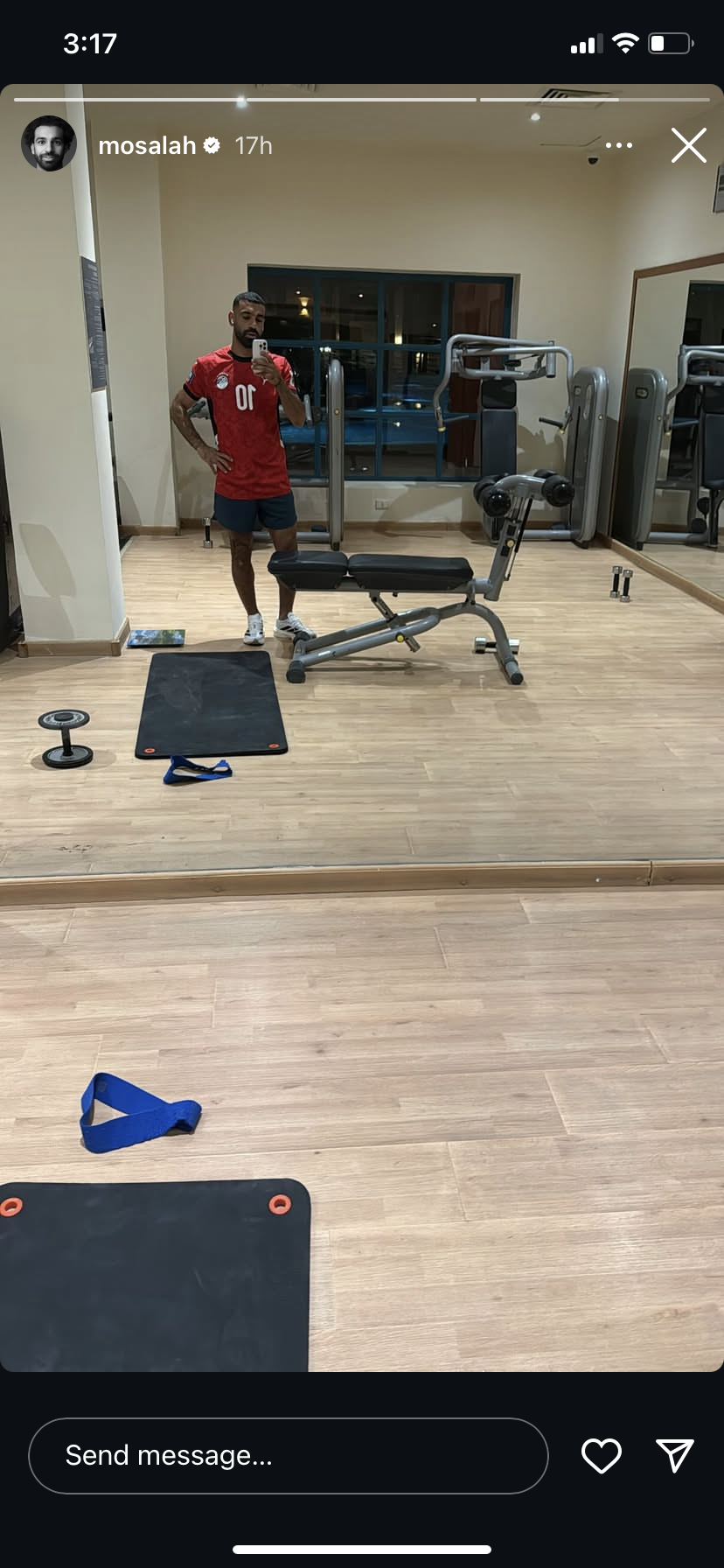 وظهر محمد صلاح،في استوري عبر حسابه علي موقع انستجرام بتشيرت المنتخب المصري وهو يستعرض لياقته البدنية من داخل الجيم، مما حازت الصورة على إعجاب متابعيه.