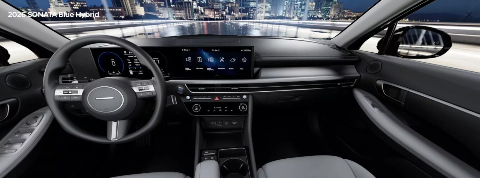 بالاضافة إلي ان سيارة هيونداي سوناتا هايبرد موديل 2026 بها، شبك أمامي أنيق، ومصابيح LED متصلة تمتد عبر عرض الواجهة الأمامية، وبها شاشة مزدوجة مقاس 12.3 بوصه، ونظام معلومات ترفيهي متطور يدعم أندرويد أوتو وآبل كار بلاي اللاسلكي.