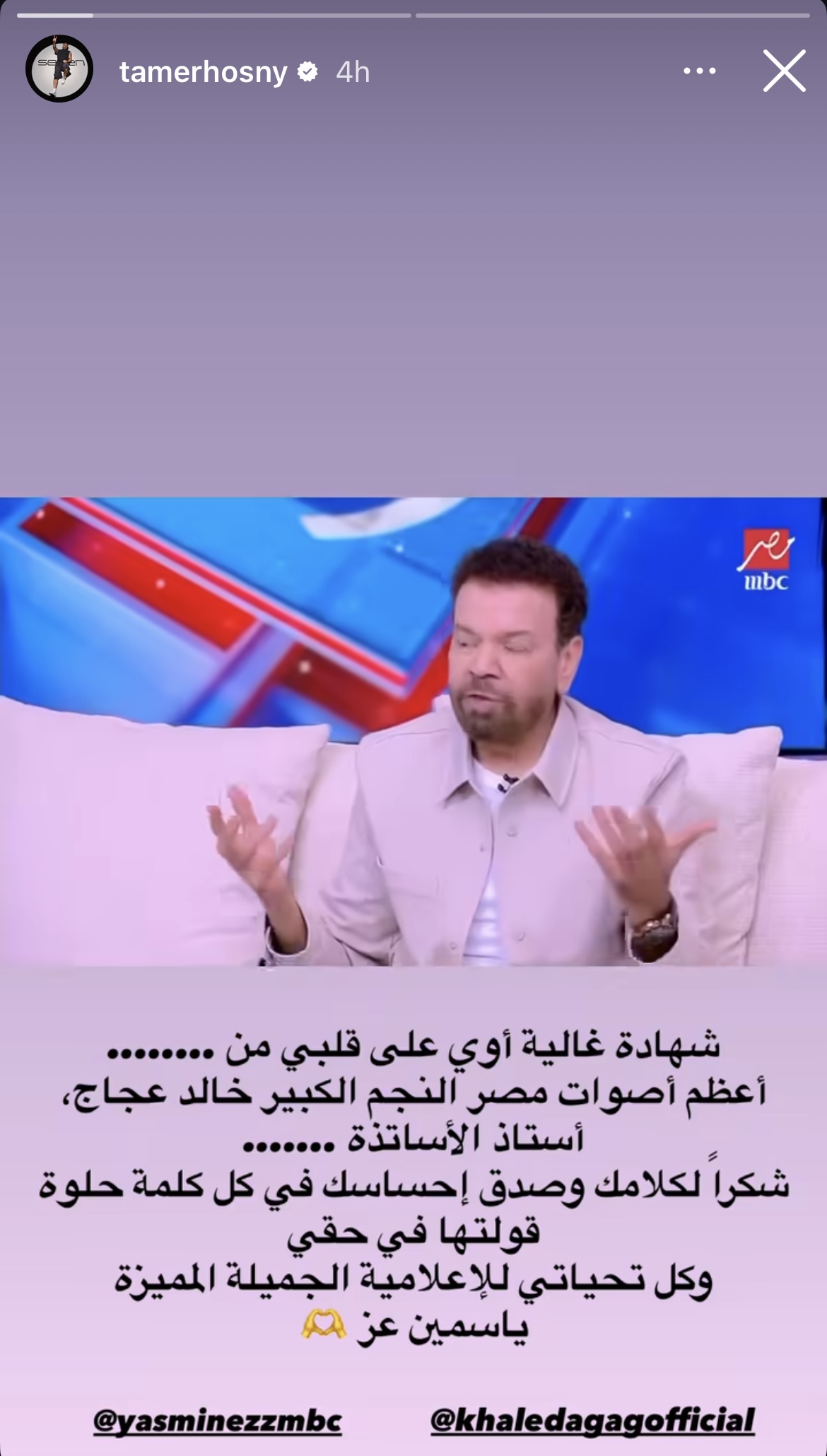 وقال تامر حسني في ستوري عبر حسابه على انستجرام: “شهادة غالية أوي على قلبي من أعظم أصوات مصر النجم الكبير خالد عجاج، شكرًا لكلامك وصدق إحساسك في كل كلمة قلتها في حقي”.