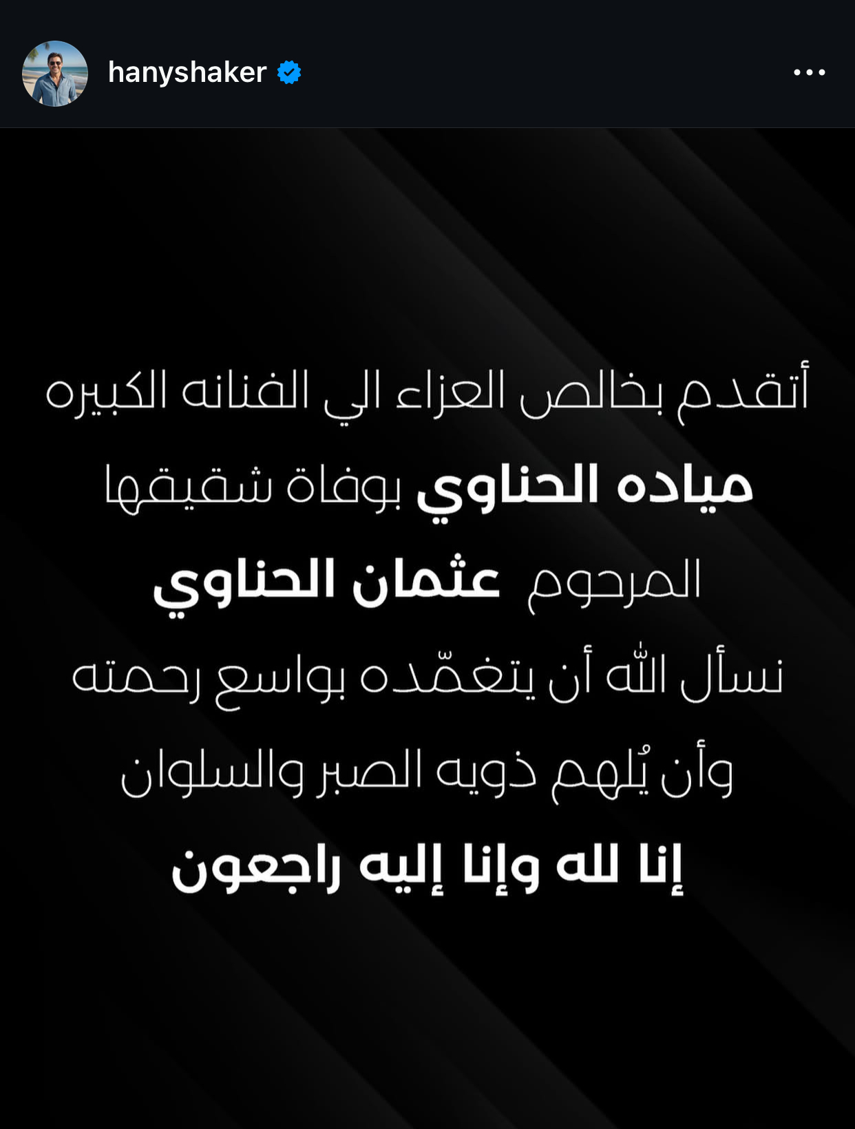 وكتب هاني شاكر على حسابه الشخصي بموقع إنستجرام: "أتقدم بخالص العزاء الي الفنانه الكبيره مياده الحناوي بوفاة شقيقها المرحوم عثمان الحناوي، نسأل اللّٰه أن يتغمّده بواسع رحمته وأن يُلهم ذويه الصبر والسلوان، إنا لله وإنا إليه راجعون".