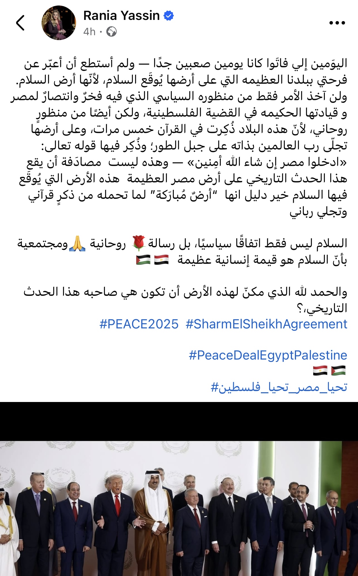 وقالت رانيا ياسين: “اليومين اللي فاتوا كانا يومين صعبين جدًا، ولم أستطع أن أعبّر عن فرحتي ببلدنا العظيمة التي على أرضها يُوقَّع السلام، لأنها أرض السلام.”