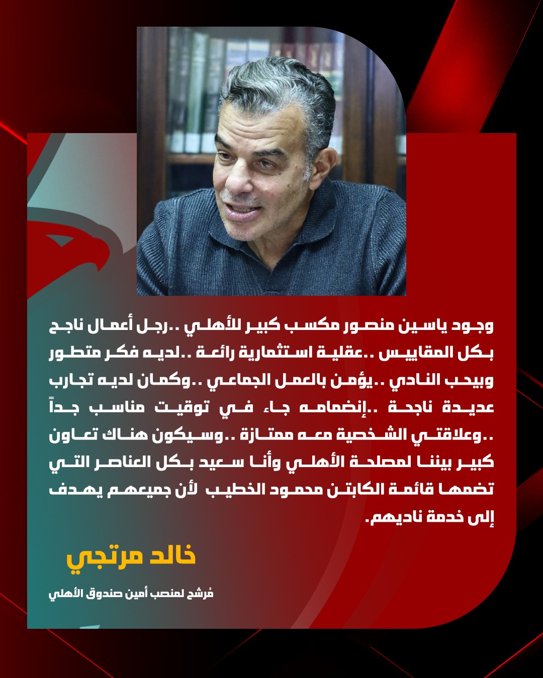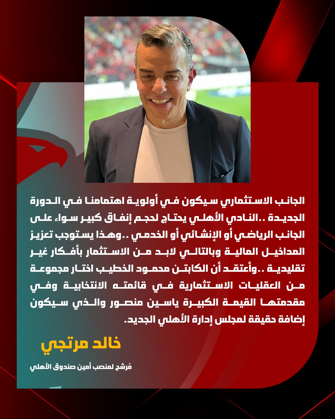 وتابع: "الجانب الاستثماري سيكون في أولوية اهتمامنا في الدورة الجديدة، النادي الأهلي يحتاج لحجم إنفاق كبير سواء على الجانب الرياضي أو الإنشائي أو الخدمي، وهذا يستوجب تعزيز المداخيل المالية، وبالتالي لا بد من الاستثمار بأفكار غير تقليدية، وأعتقد أن الكابتن محمود الخطيب اختار مجموعة من العقليات الاستثمارية في قائمته الانتخابية، وفي مقدمتها القيمة الكبيرة ياسين منصور، والذي سيكون إضافة حقيقة لمجلس إدارة الأهلي الجديد".