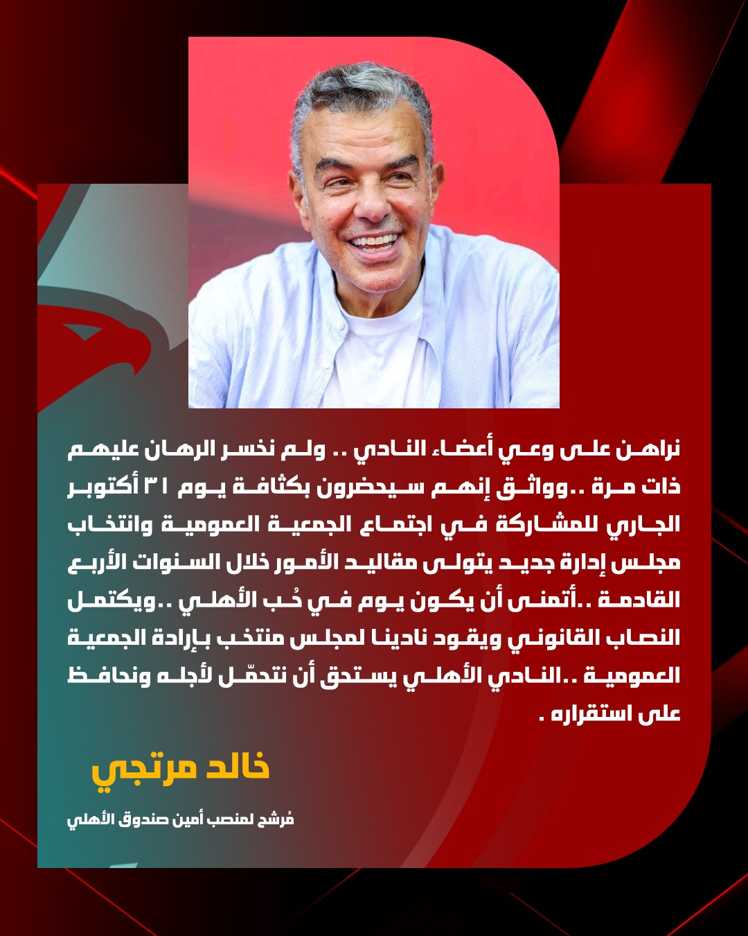 وقال: “نراهن على وعي أعضاء النادي، ولم نخسر الرهان عليهم ذات مرة، وواثق أنهم سيحضرون بكثافة يوم 31 أكتوبر الجاري للمشاركة في اجتماع الجمعية العمومية وانتخاب مجلس إدارة جديد يتولى مقاليد الأمور خلال السنوات الأربع القادمة”.