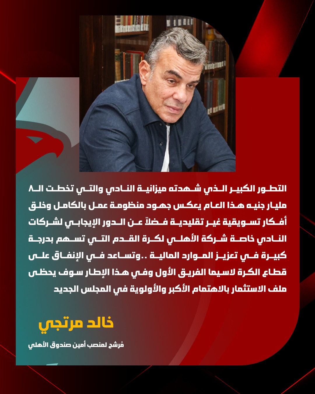 أكد المهندس خالد مرتجى، أمين صندوق الأهلي والمرشح لذات المنصب في الانتخابات التي ستقام يوم 31 أكتوبر، أن التطور الكبير الذي شهدته ميزانية النادي والتي تخطت الـ8 مليارات جنيه هذا العام، يعكس جهود منظومة عمل بالكامل، وخلق أفكار تسويقية غير تقليدية، فضلاً عن الدور الإيجابي لشركات النادي، خاصة شركة الأهلي لكرة القدم التي تسهم بدرجة كبيرة في تعزيز الموارد المالية، وتساعد في الإنفاق على قطاع الكرة، لا سيما الفريق الأول، وفي هذا الإطار سوف يحظى ملف الاستثمار بالاهتمام الأكبر والأولوية في المجلس الجديد.