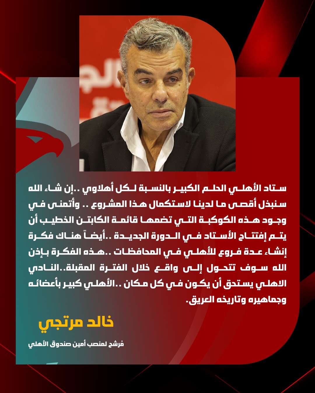 وقال مرتجى: “ستاد الأهلي الحلم الكبير بالنسبة لكل أهلاوي.. إن شاء الله سنبذل أقصى ما لدينا لاستكمال هذا المشروع.. وأتمنى في وجود هذه الكوكبة التي تضمها قائمة الكابتن الخطيب أن يتم افتتاح الاستاد في الدورة الجديدة.. أيضاً هناك فكرة إنشاء عدة فروع للأهلي في المحافظات.. هذه الفكرة بإذن الله سوف تتحول إلى واقع خلال الفترة المقبلة”.