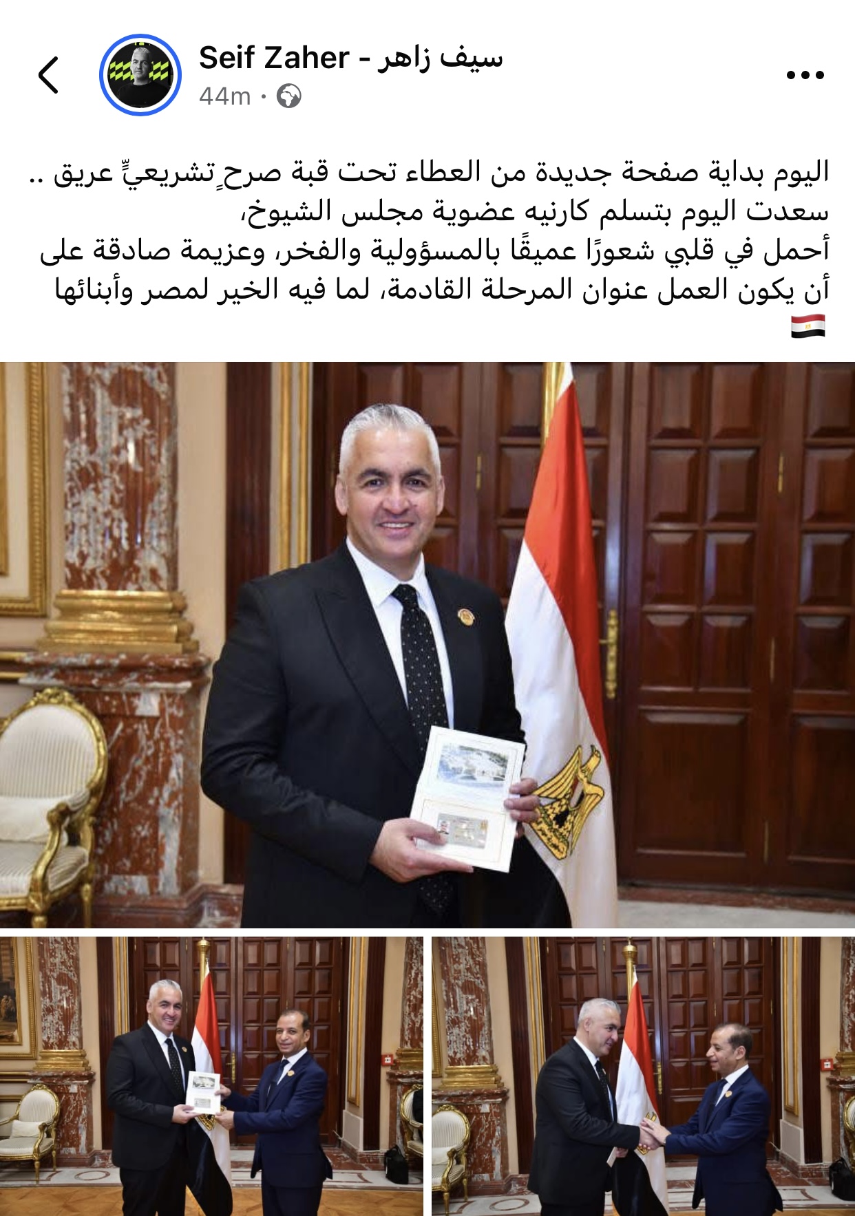 سعدت اليوم بتسلم كارنيه عضوية مجلس الشيوخ، أحمل في قلبي شعورًا عميقًا بالمسؤولية والفخر، وعزيمة صادقة على أن يكون العمل عنوان المرحلة القادمة، لما فيه الخير لمصر وأبنائها".