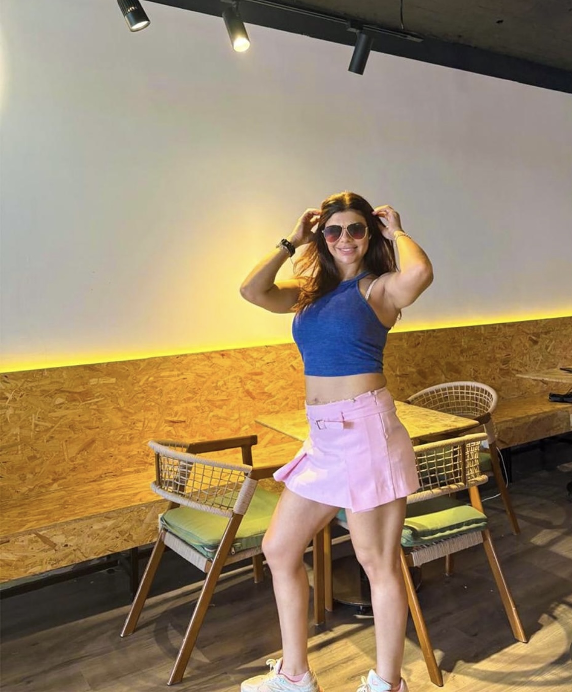 وتألقت أميرة فتحى بإطلالة جريئة خطفت بها الانظار وارتدت اميرة فتحى تنورة قصيرة باللون الوردي وبلوزة قصيرة تكشف عن خصرها باللون الأزرق.