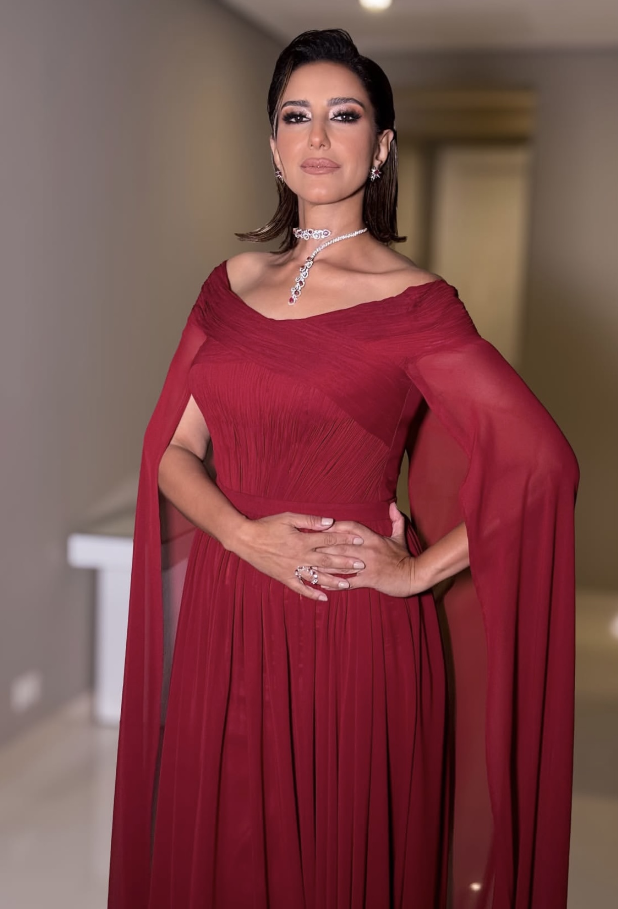 ونسقت إطلالتها حقيبة يد باللون الأسود الأنيق، واختارت أن تسريحة الشعر المنسدل بطريقة تناسب إطلالتها المميزة