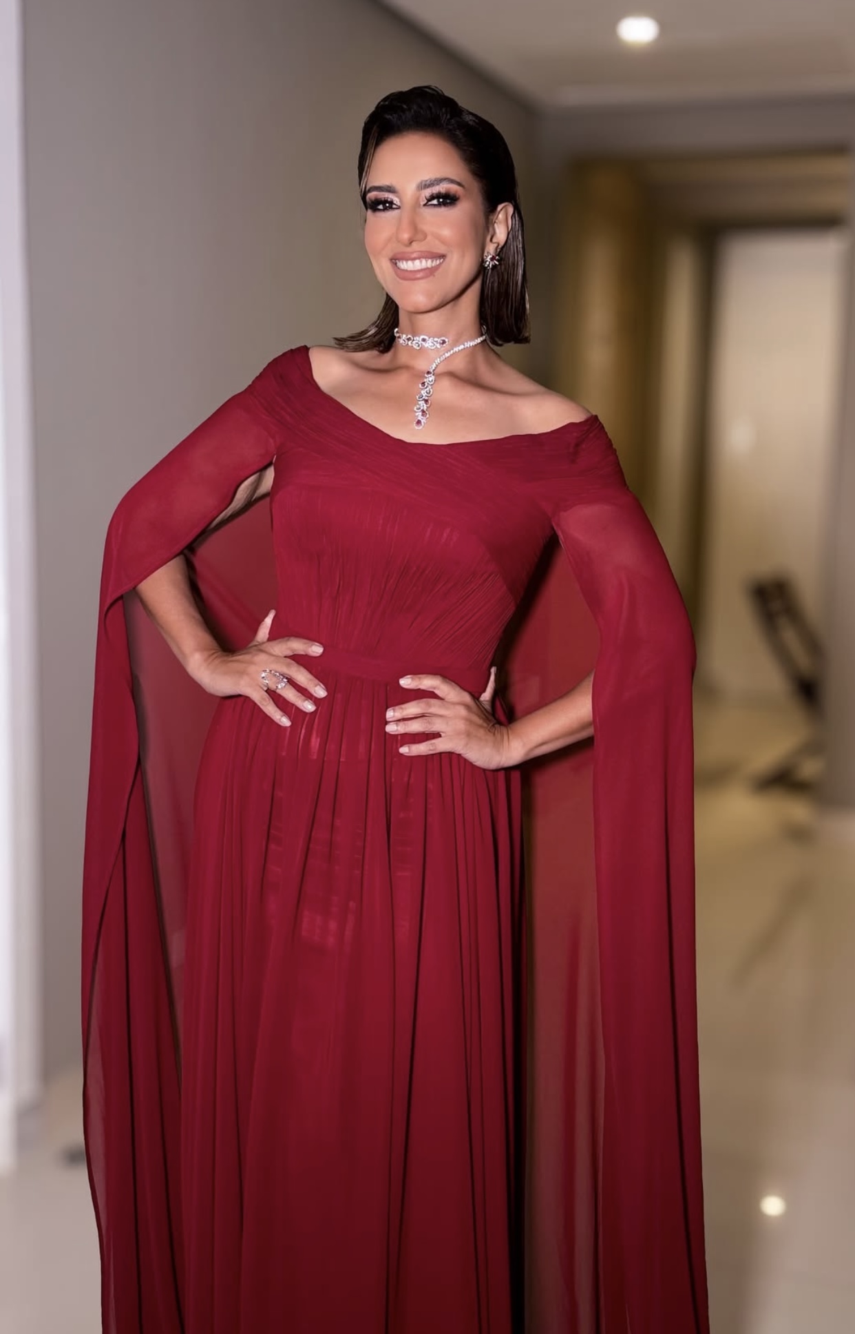 وارتدت مطاوع فستان طويل منفوش من الأسفل باللون الأحمر، ومن الناحية الجمالية، اعتمدت مكياجا ناعما، حيث وضعت أحمر شفاه باللون الوردي