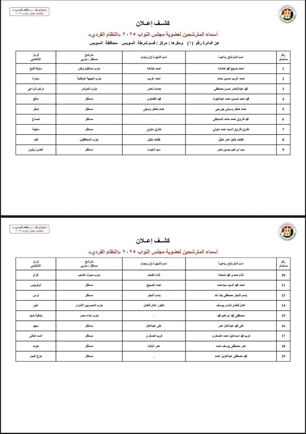 ينشر موقع صدى البلد بالأسماء المترشحين المتقدمين بأوراق ترشحهم لخوض انتخابات مجلس النواب بـ محافظة السويس وتبلغ عدد دوائرها، دائرة واحدة، وهي كالتالي: