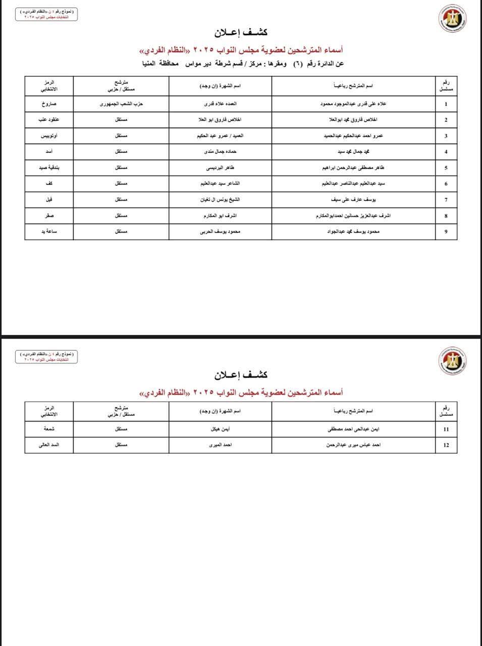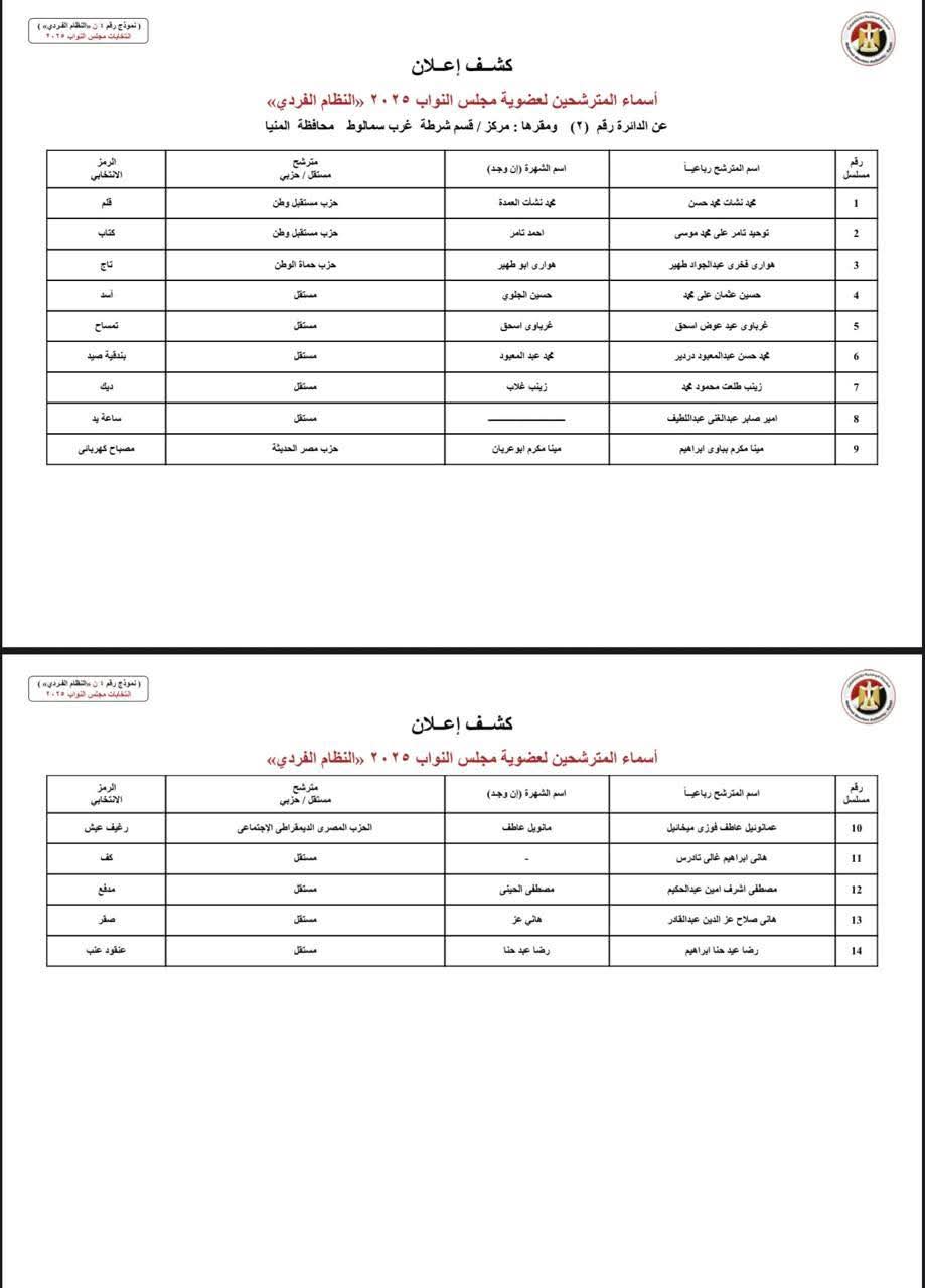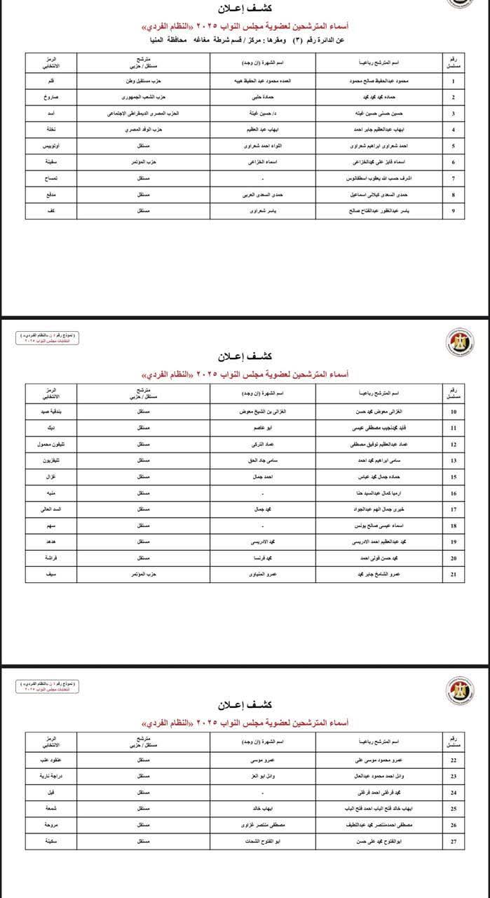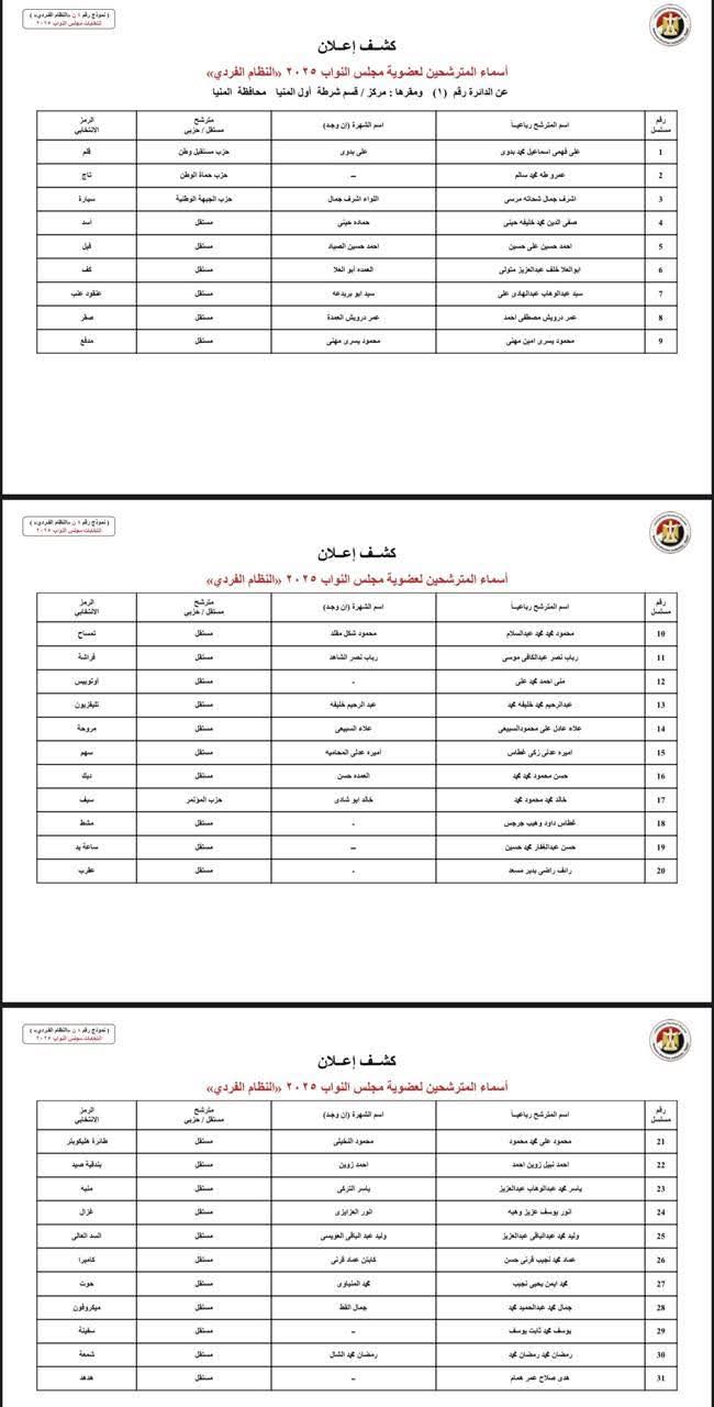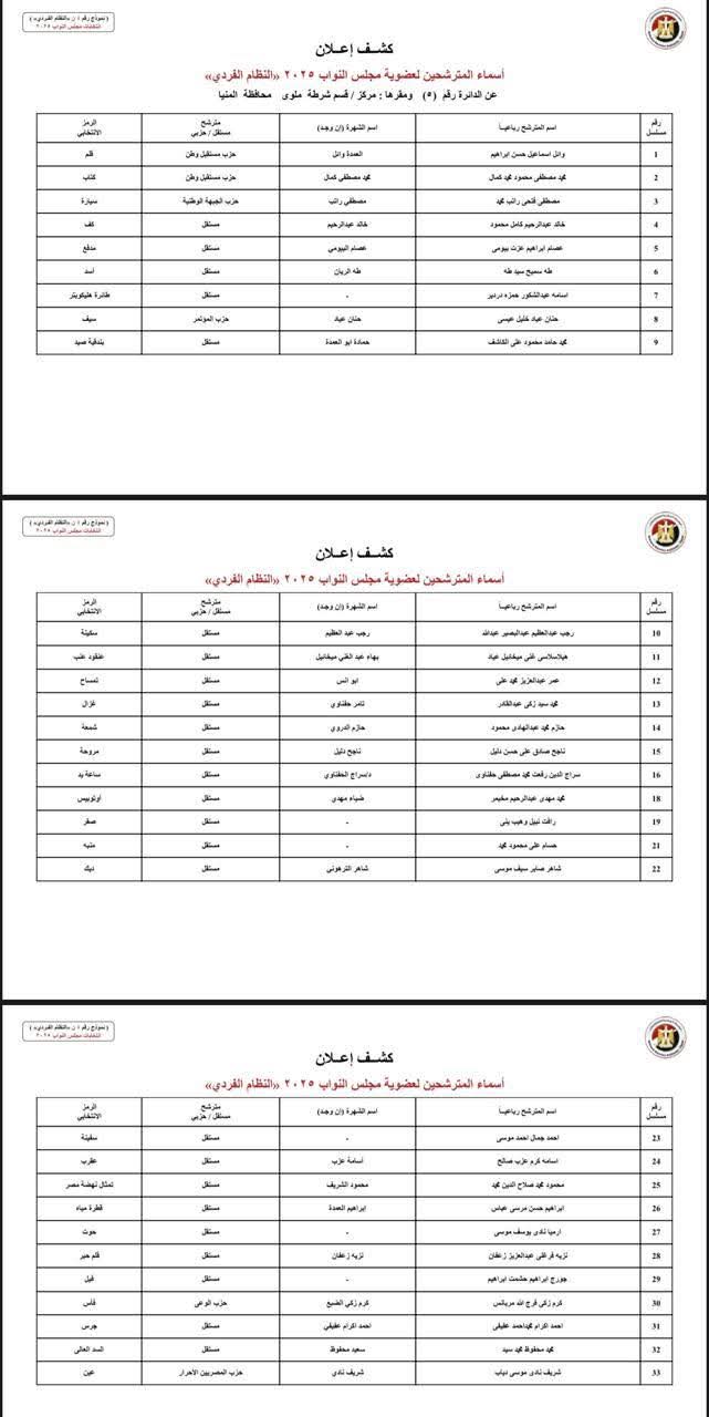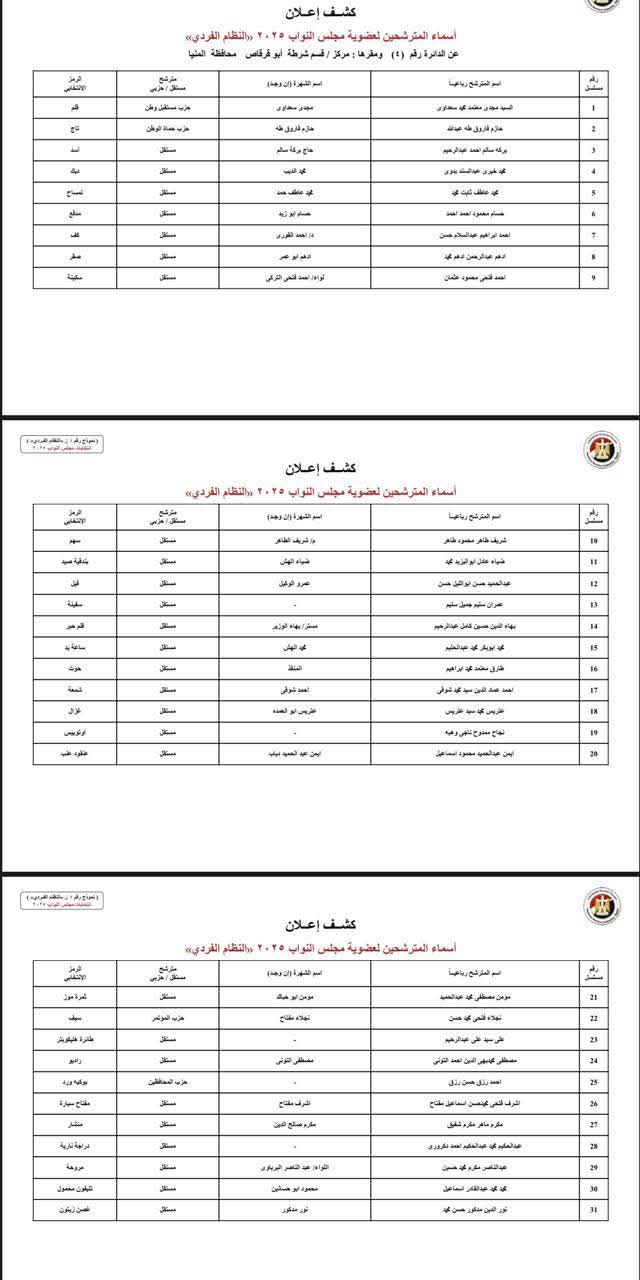 ينشر موقع صدى البلد أسماء المرشحين المتقدمين بأوراق ترشحهم لخوض انتخابات مجلس النواب بـ محافظة المنيا وتبلغ عدد دوائرها، 6 دوائر، وهي كالتالي: