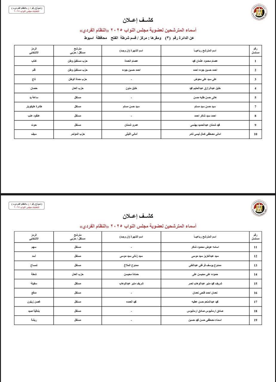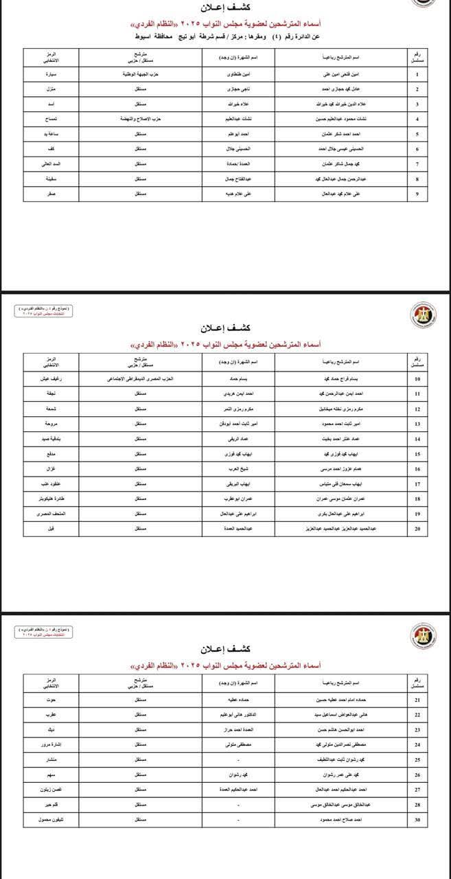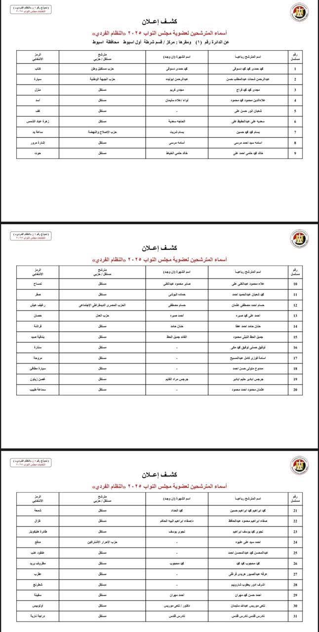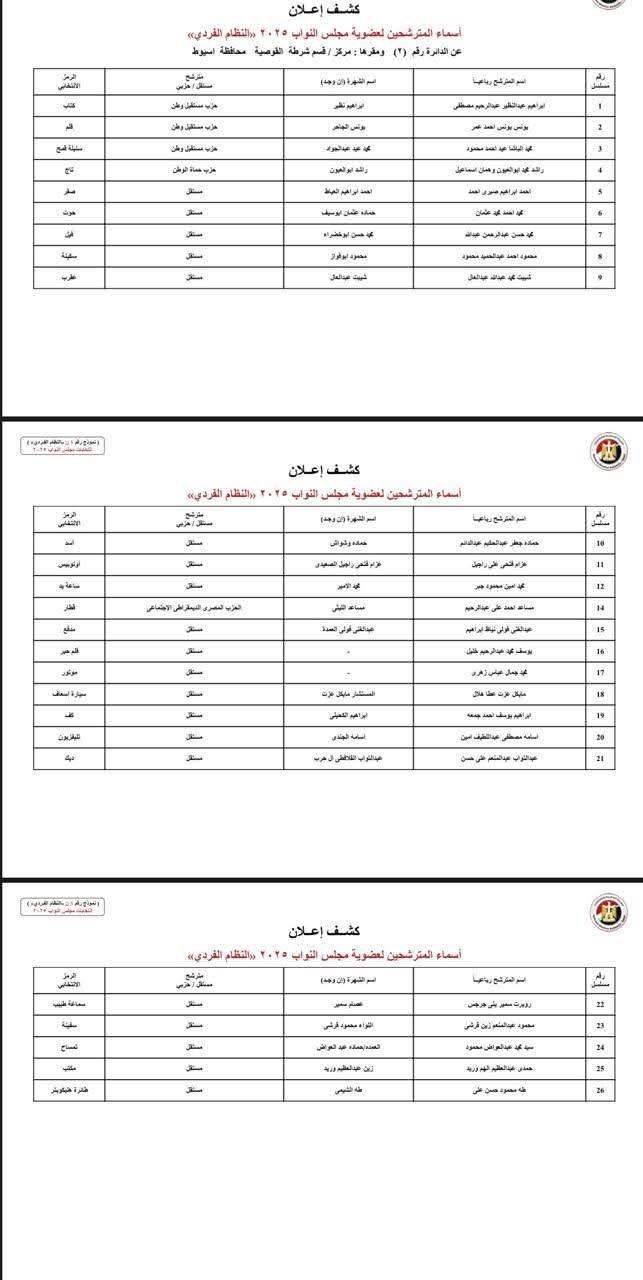 ينشر موقع صدى البلد أسماء المرشحين المتقدمين بأوراق ترشحهم لخوض انتخابات مجلس النواب بـ محافظة أسيوط وتبلغ عدد دوائرها، 4 دوائر، وهي كالتالي: