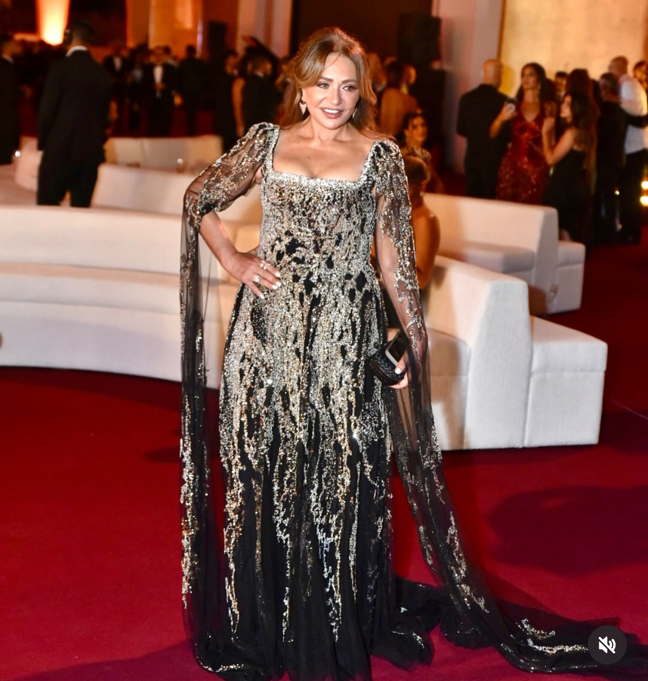 وظهرت ليلى علوي بفستان أسود أنيق مرصع بالتطريزات الفضية البراقة، تميز بتصميمه الراقي وأكمامه الشفافة المزينة بالتفاصيل اللامعة، ما منحها طابعًا من الفخامة والأنوثة.
